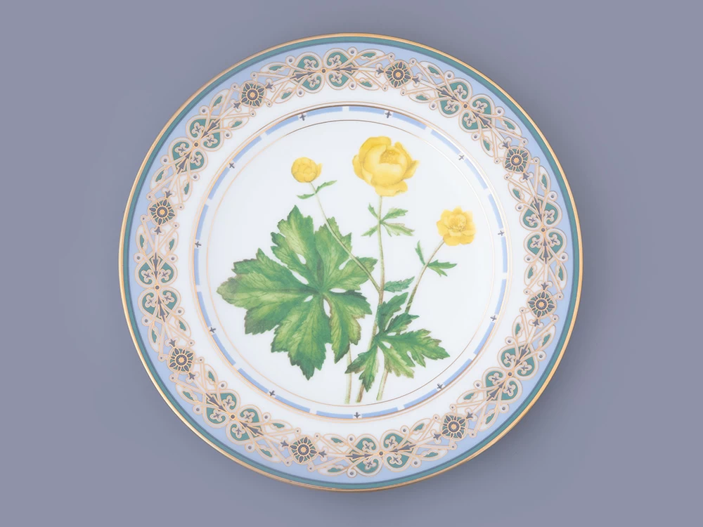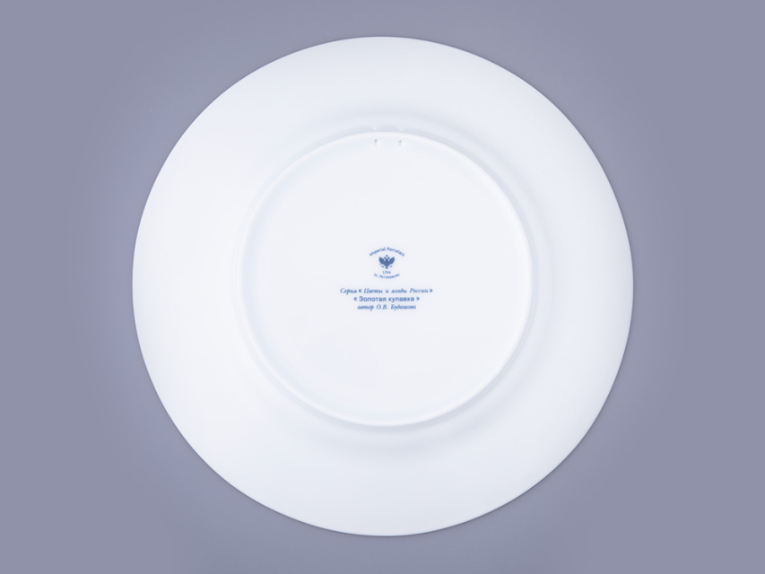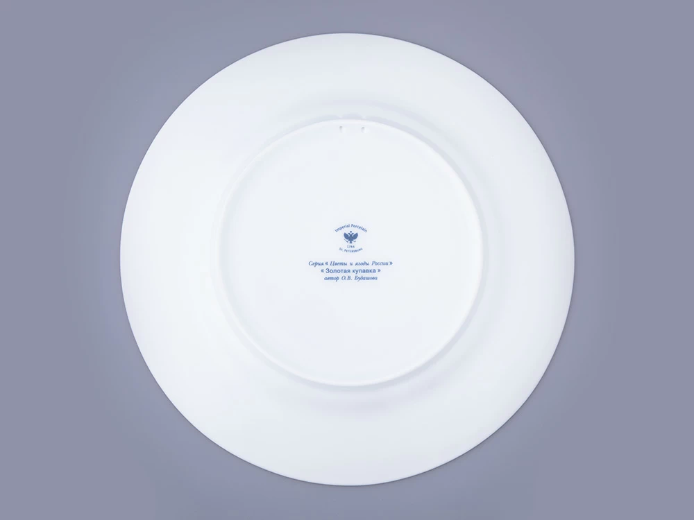 Декоративная тарелка с золотой купавкой вошла в коллекцию «Цветы и ягоды России». Композиция на фарфоре, выполненная в эстетике винтажных ботанических иллюстраций, дополнена орнаментальным бортом. Рисунок представляет собой авторское размышление на тему национальной вышивки.
