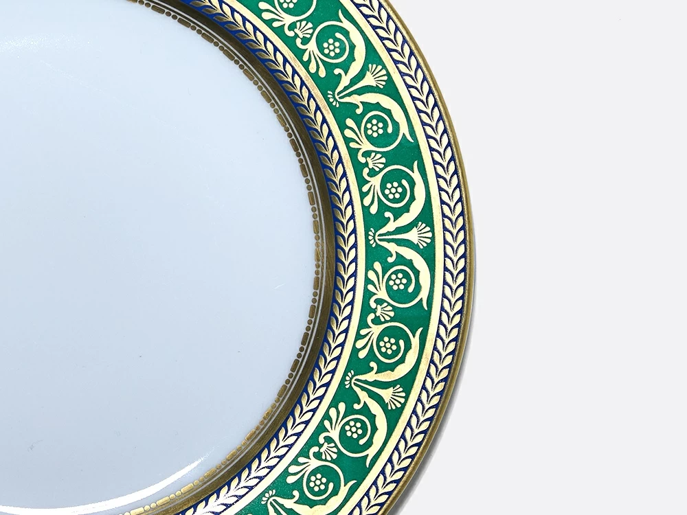 Роспись сервиза выполнена в технике надглазурной живописи надглазурными красками и золотосодержащим препаратом. По тулову , чашек, борту тарелок и вокруг зеркальца блюдец золотой орнаментальный рисунок на зеленом и синем фоне. Ручки и носики всех предметов и держатели крышек покрыты 52% з/с препаратом при помощи кисти. Отводка по каске чайника, кофейника, сахарницы , сливочника и по краю чашки 52% з/с препаратом.