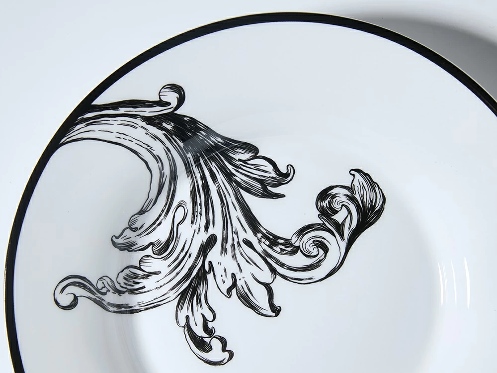 На благородной поверхности предметов запечатлены элементы усадебной архитектуры: изящные гирлянды и розетки, листья аканта и капители ордеров, которые гармонично переместились с архитектурных сооружений на тончайший костяной фарфор. Техника гравюры рождает тонкую игру света и тени, подчеркивая изящество рельефного декора.