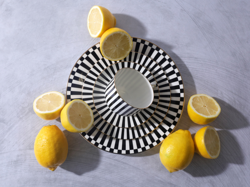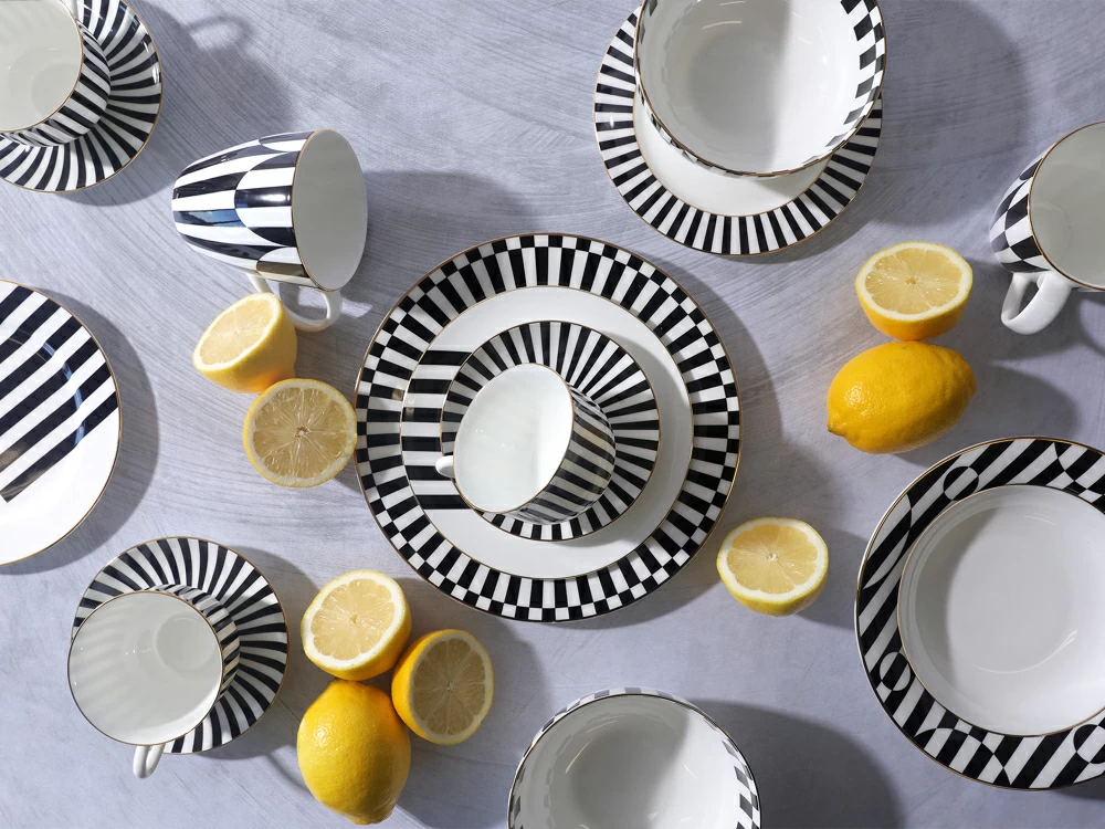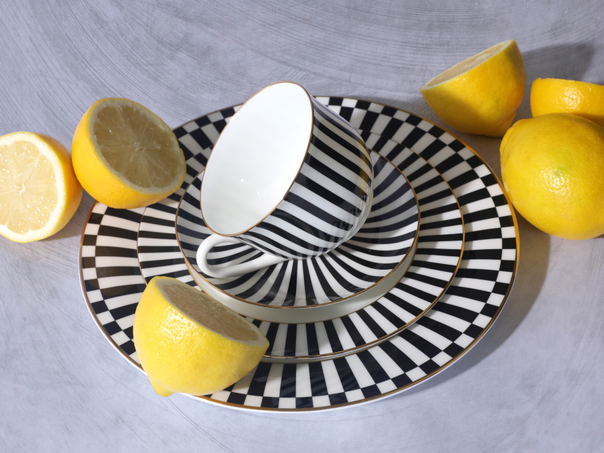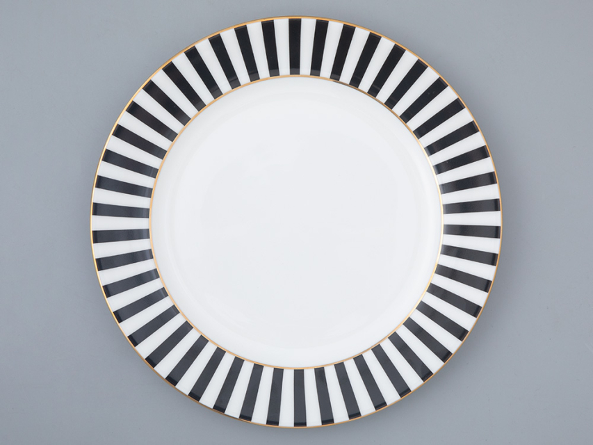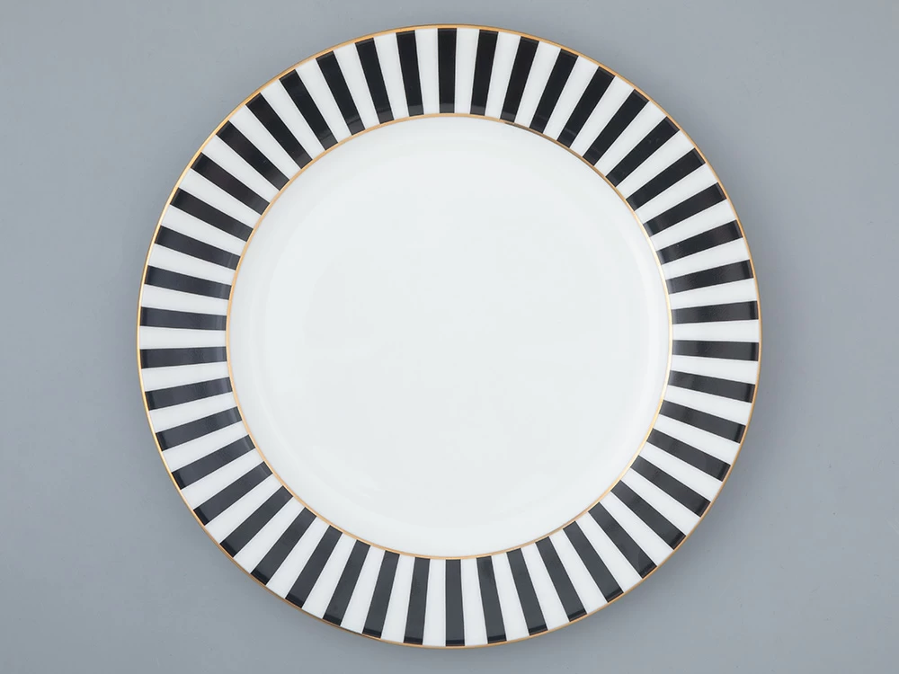 Тарелка стала продолжением популярной коллекции «Да и нет» от Заслуженного художника РФ Сергея Соколова. Идея декора гениально проста. Автор мастерски использует ритм цветных полосок, которые подчеркивают форму предметов и белизну костяного фарфора. Черный цвет на фарфоре – всегда особенная история. Он составляет идеальную пару белоснежному материалу, а самому предмету придает строгий и лаконичный вид.