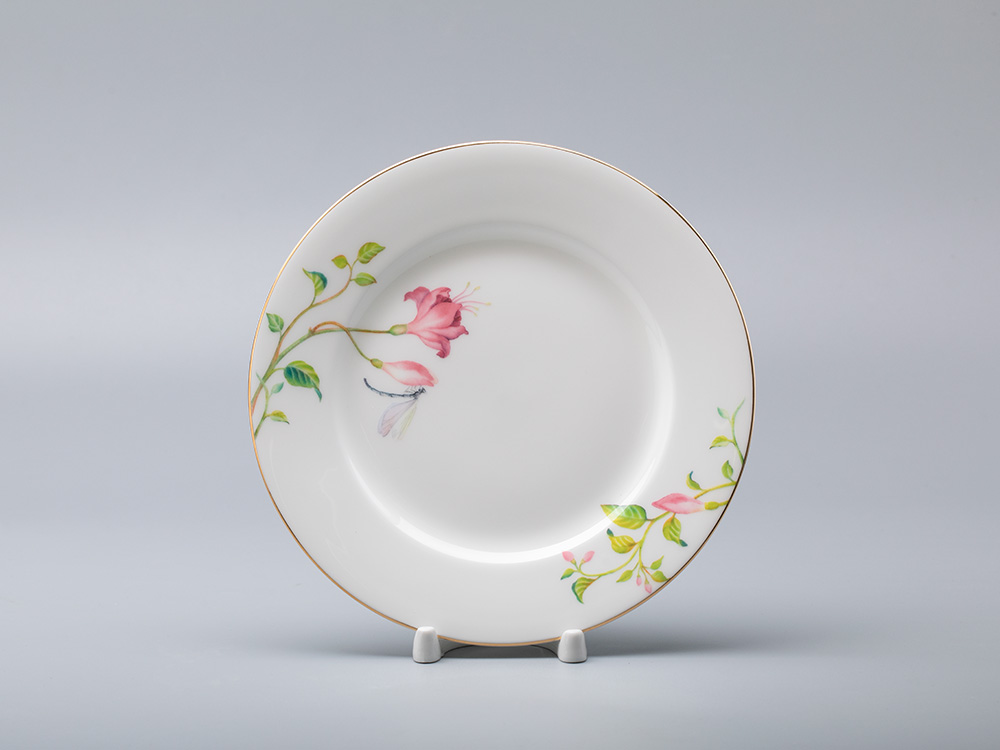 Фарфор костяной; декорирование надглазурное полихромное; позолота. Декоративный мотив коллекции «Сад мечты» – это нежный цветок фуксии. Автор рисунка, Ольга Будашова, неспроста выбрала именно это экзотическое растение. Считается, что фуксия привлекает удачу, а также является пожеланием любви и счастья. Декор выполнен в полупрозрачных тонах и напоминает акварельную живопись. Такой рисунок замечательно сочетается с материалом – воздушным костяным фарфором – и подчеркивает его достоинства. Для особой декоративности все предметы коллекции украшены золотыми отводками.