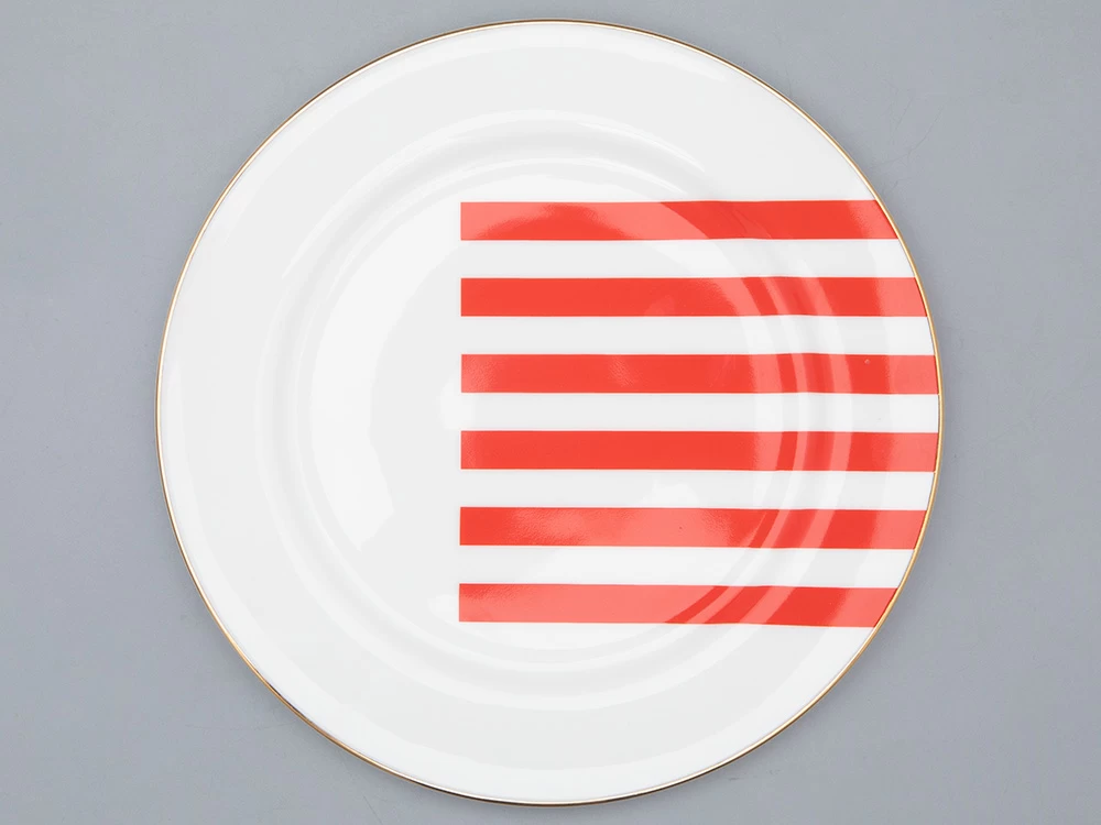 Тарелки с красными полосами будут эффектно смотреться в моноцветовой сервировке, а также хорошо сочетаются с другими цветами коллекции «Да и нет».