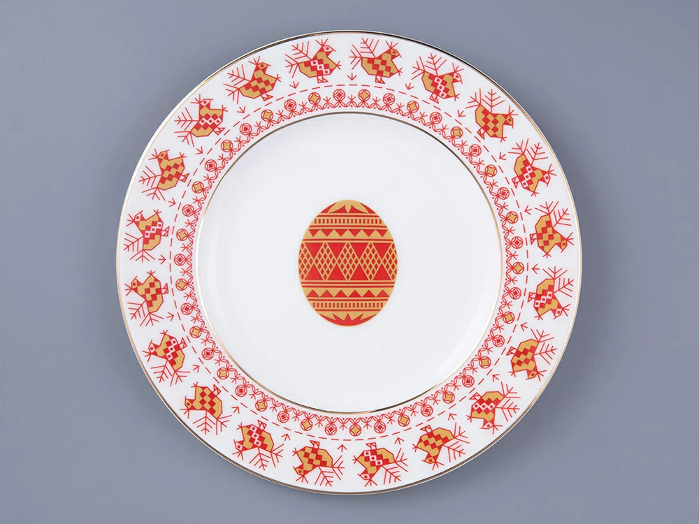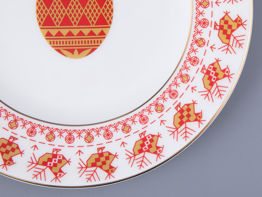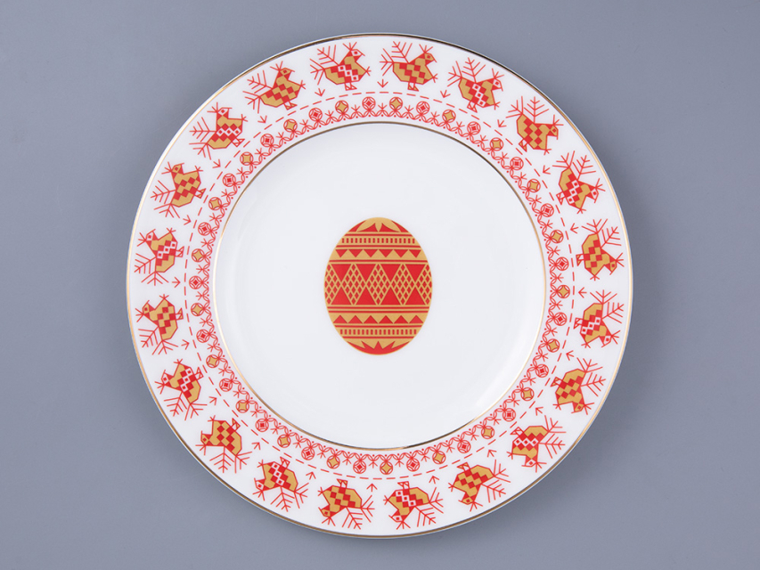 Тарелка «Петушки-гребешки» – яркий выбор для пасхального стола. Рисунок, созданный по мотивам знаменитой каргопольской вышивки, переносит в мир русской народной эстетики. По борту тарелки художник располагает круговой орнамент из очаровательных курочек – характерный для каргопольской вышивки узор. А в центре тарелки – расписное яйцо – писанку. Такая тарелка замечательно подойдет для сервировки пасхального стола и подачи праздничных лакомств. Тарелка выполнена из высококачественного костяного фарфора.