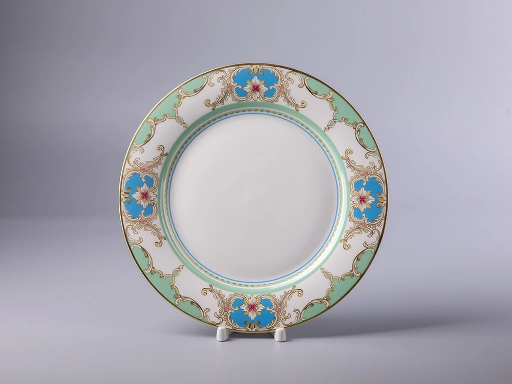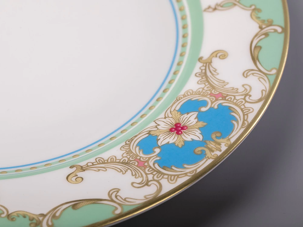 «Аквамарин» - изумительное сочетание белизны костяного фарфора, сервизной формы "Айседора" и роскошной росписи. Основной декоративный мотив – растительная композиция из ветвей и ягод остролиста. Остролист, также его называют падубом, у разных народов символизирует вечность, здоровье и счастье. Это вечнозеленое растение, использовавшееся для украшения еще древними римлянами, и сегодня – один из главных героев новогоднего и рождественского убранства. Одна из важных составляющих декора – гармоничное сочетание цветов. Как и в других своих работах, автор отдает предпочтение благородным, чуть приглушенным натуральным оттенкам. Зеленый цвет символизирует жизнь, небесно-голубой - чистоту и радость, а синий - мудрость и богатство. Такая цветовая палитра с богатой росписью золотом рождает ансамбль, который станет эффектной частью праздничной сервировки.