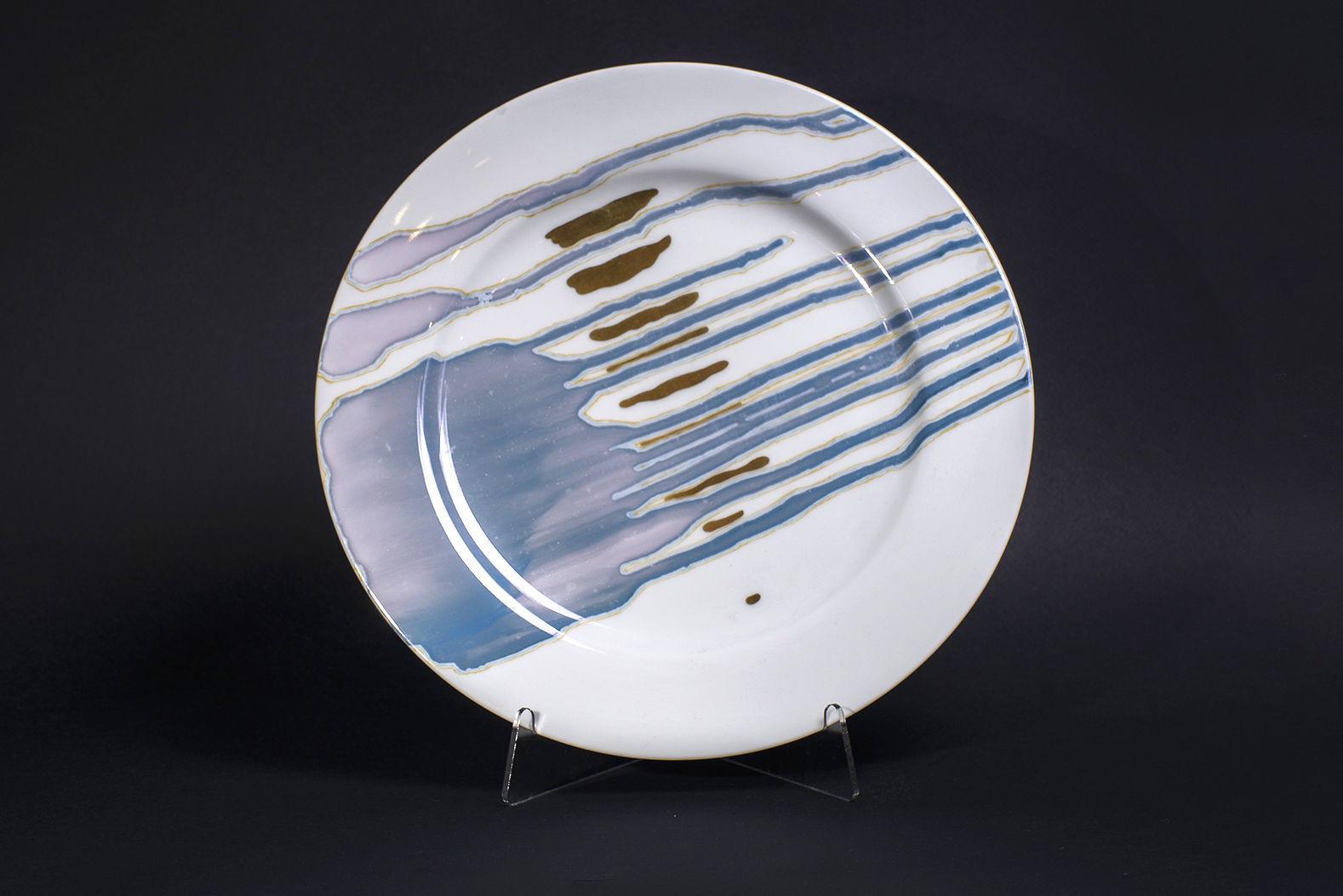 На тарелке из композиции «Таяние» нашли свое выражение эффектный декор, созвучный эстетике минимализма, и актуальные тенденции интерьерного дизайна. Юлия Жукова обращается к интересному приему «соавторства» с материалом: позволяя текущей краске создать собственный узор, она на художественном уровне «расшифровывает» его, дополняя линиями и золотыми акцентами. Люстровые краски на белоснежной поверхности рождают ассоциацию с пробуждением природы, что также отзывается в названии.