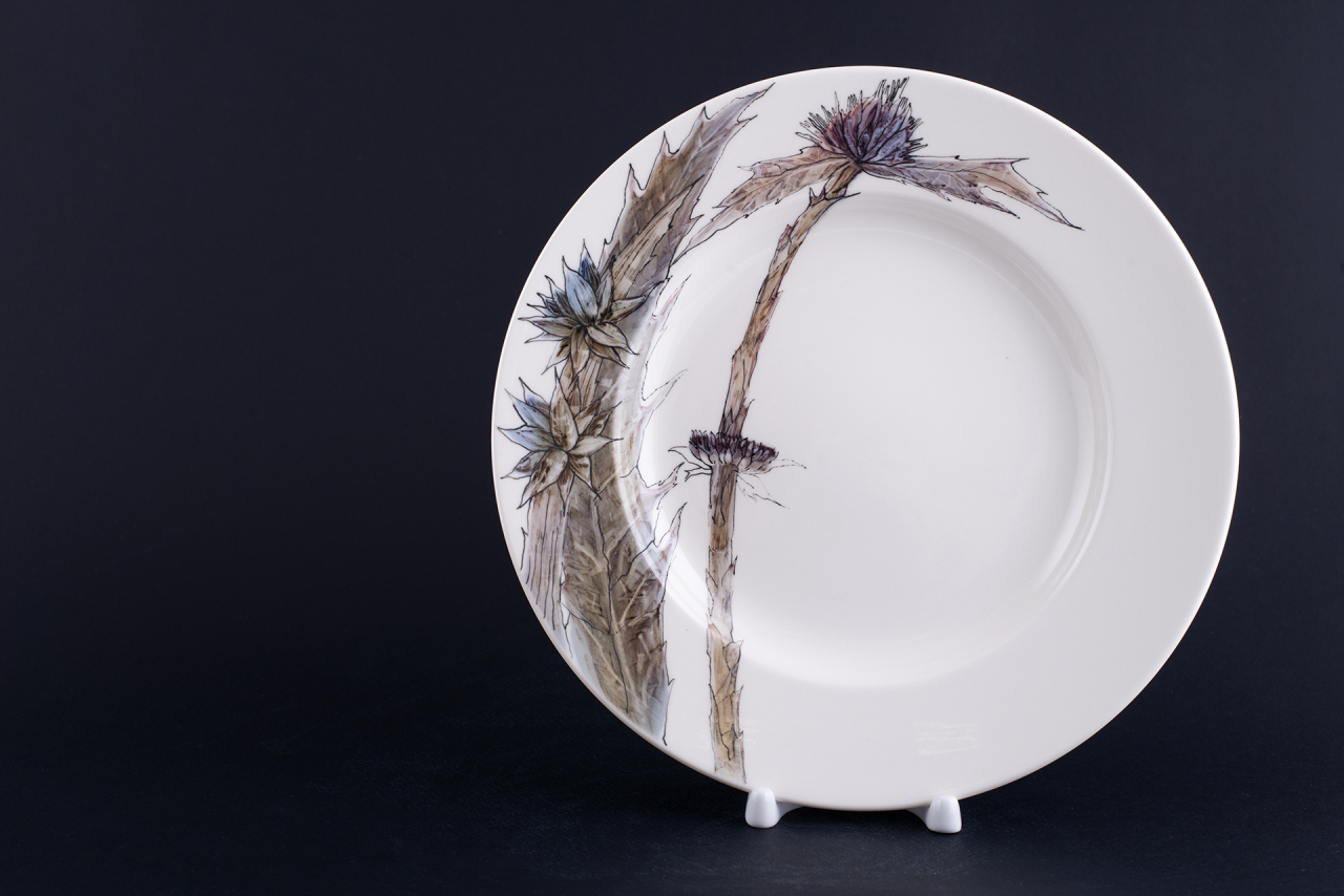 Растительная тематика – одна из любимых в творчестве Татьяны Чапургиной. Тарелка вошла в серию «Русские обочины», которую художник посвятила разнообразию отечественной флоры Неприхотливые растения, среди которых – степная колючка и репейник, растущие по обочинам и на пустырях, стали главными героями серии.