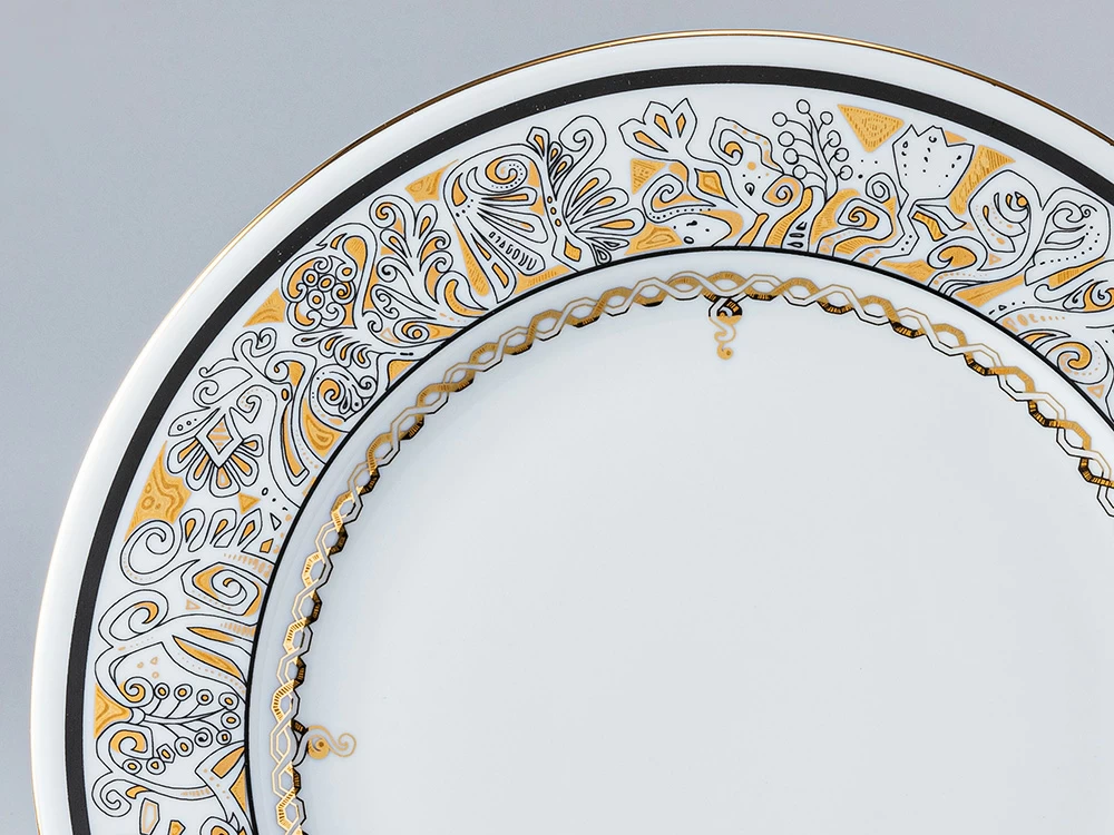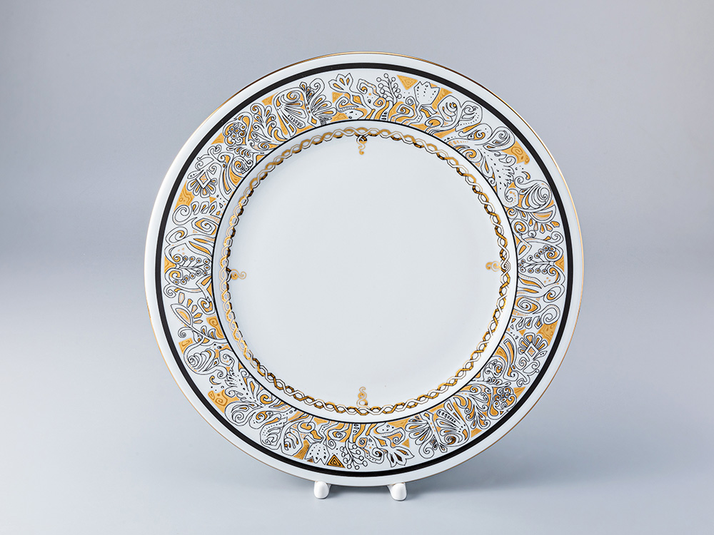 Императорский фарфоровый завод представляет новинку — тарелки «Русский модерн» художника Ольги Беловой-Вебер. В их росписи автор использовала художественные образы каменной резьбы по фасаду Покровского собора Марфо-Мариинской обители. Изделия декорированы золотым фигурным фантасмагоричным орнаментом, который гармонично обыгрывает форму предметов. Эти тарелки могут стать прекрасным дополнением к одноименному чайному сервизу или самостоятельным произведением искусства и украшением вашего стола.