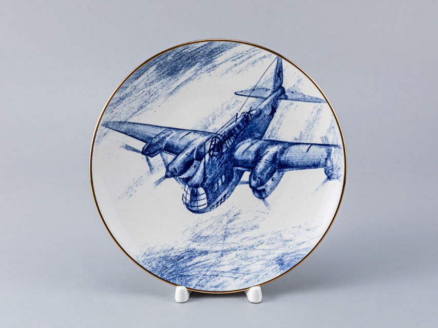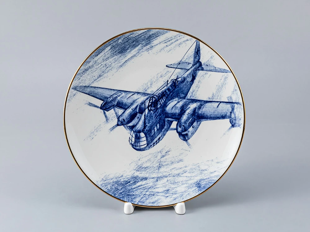 В серию «Обнимая небо» входит тарелка, на которой изображен советский пикирующий бомбардировщик Пе-8 времён Второй мировой войны. Это – самый массовый бомбардировщик советского производства, он был принят на вооружение в 1941 году и сыграл выдающуюся роль в завоевании Победы.