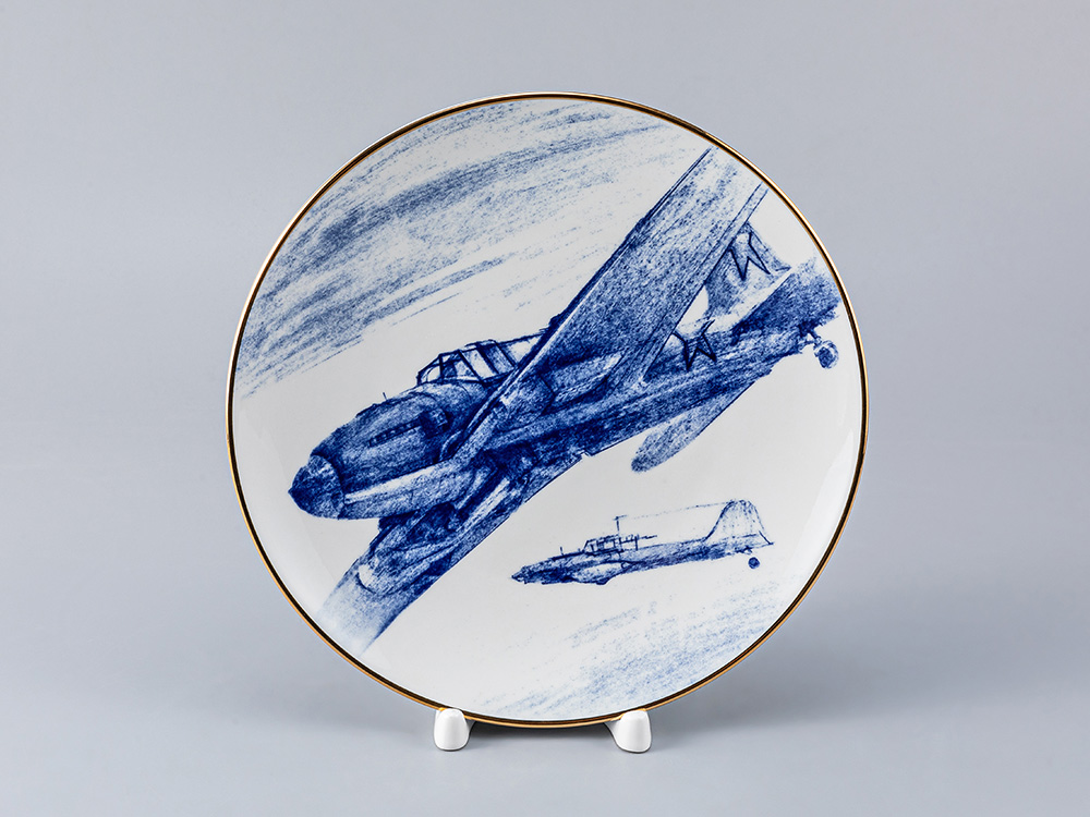 На тарелке из серии «Обнимая небо» изображен штурмовик Ил-2. Запущенный в эксплуатацию в 1941 году «летающий танк», как называли его конструкторы, Ил-2 стал самым массовым самолетом в истории авиации. Современники отмечали феноменальную огневую мощь штурмовика и его выносливость.