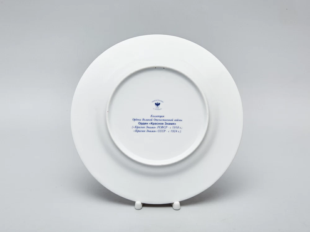 По центру тарелки изображен Орден Великой Отечественной войны: Орден «Красное Знамя». Орден «Красное Знамя» («Красное Знамя» РСФСР - с 1918 г.; «Красное Знамя» СССР - с 1924 г.) был наградой за особую храбрость, самоотверженность и мужество при непосредственной боевой деятельности. По борту тарелки расположена лента ордена, а по краю – золотая отводка.