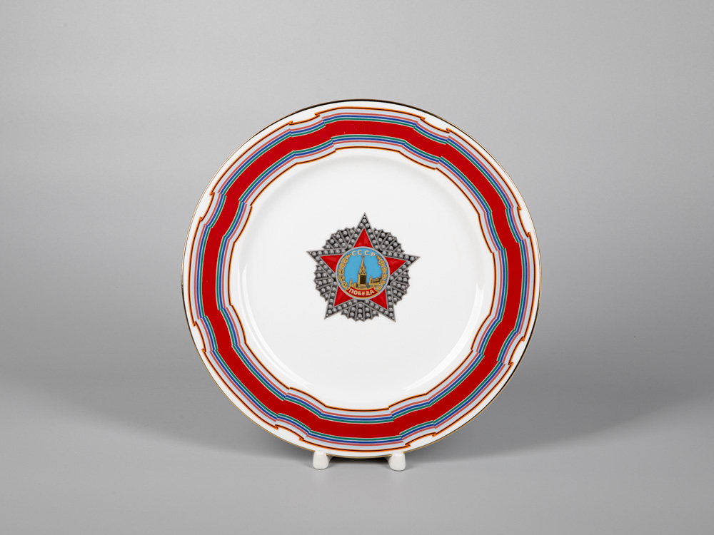 По центру тарелки изображен Орден Великой Отечественной войны: Орден «Победа». Орден «Победа», учрежденный в 1943 году, присуждался за успешное проведение боевых операций, в результате которых в корне менялась обстановка в пользу Красной Армии. Кавалерами ордена за всю историю награждений стали 17 человек (дважды - И.В. Сталин, Г.К. Жуков, А.М. Василевский). По борту тарелки расположена лента ордена, а по краю – золотая отводка.