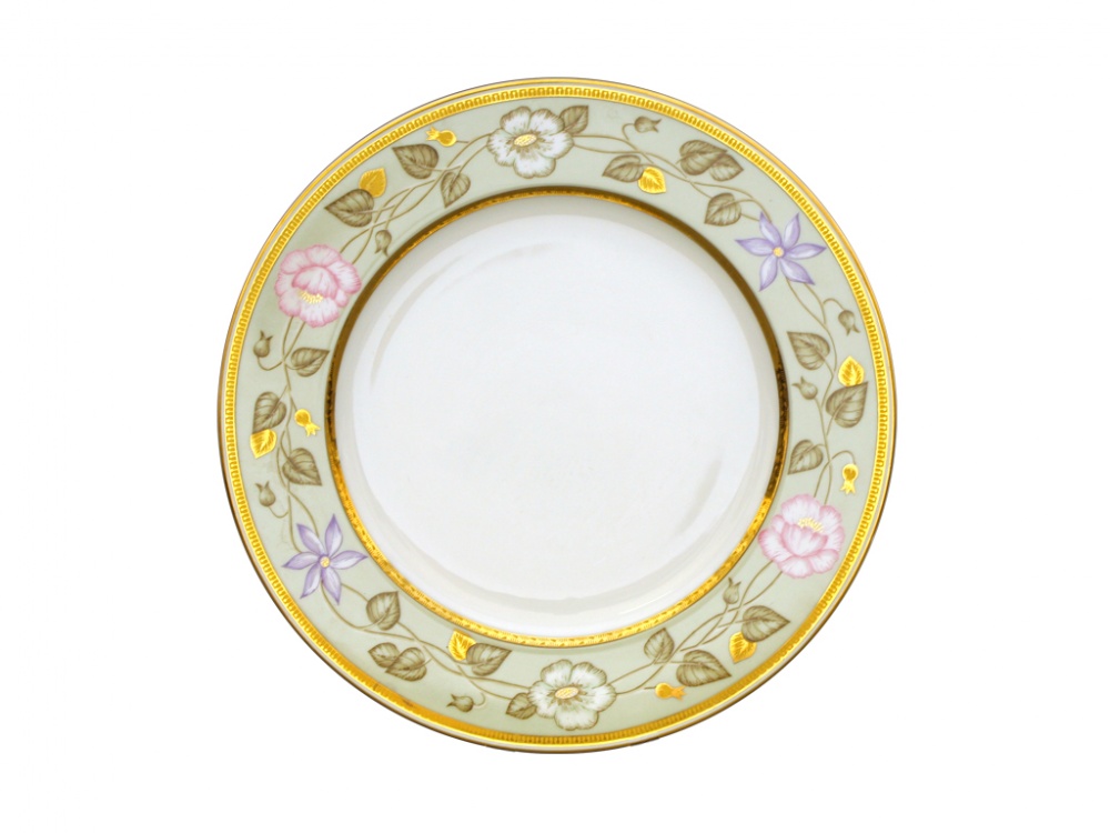По борту мелкой тарелки ?220 и глубокой тарелки ?225 гирлянда из золотых листьев в обрамлении двух золотых окантовок. По борту мелкой тарелки ?265 широкая нефритовая лента, обрамленная золотыми окантовками и росписью горизонтальной ветки с белыми, голубыми и розовыми цветами.