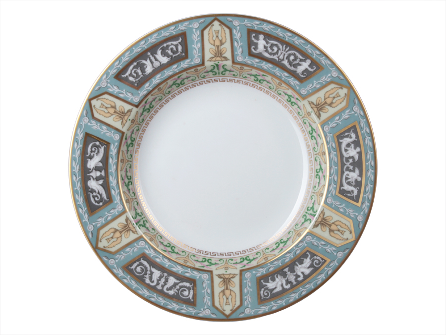 Рисунок "Античный" выполнен по мотивам музейного образца знаменитого "Рафаэлевского" столового ансамбля, который был заказан на ИФЗ в 1883 году Александром III, и назван так по орнаменту, скопированному с рисуноков знаменитой галереи, сооруженной в началне XVI в Ватикане во дворце Папы Римского, по проекту архитектора Д.Браманте. Выпуск изделия начался в 2017 году.