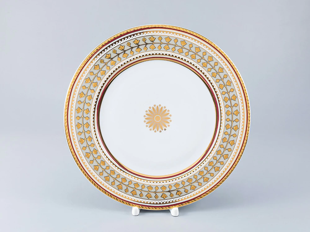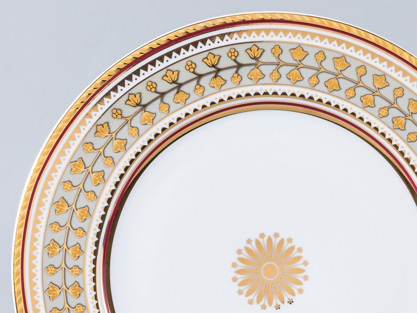 Коллекция «Бельведер» - это современная реплика «Бабигонского» сервиза, исполненного на Императорском фарфоровом заводе в 1824 году для Большого Петергофского дворца. Основной декоративный мотив, использованный в оформлении, – орнаментальная лента, представляющая собой гирлянду из золотых стилизованных листьев на сером фоне в обрамлении тонких малиновых отводок. В середине XIX века сервизный ансамбль был передан во дворец Бельведер, построенный на Бабигонском холме в Петергофе по проекту архитектора А.И. Штакеншнейдера.