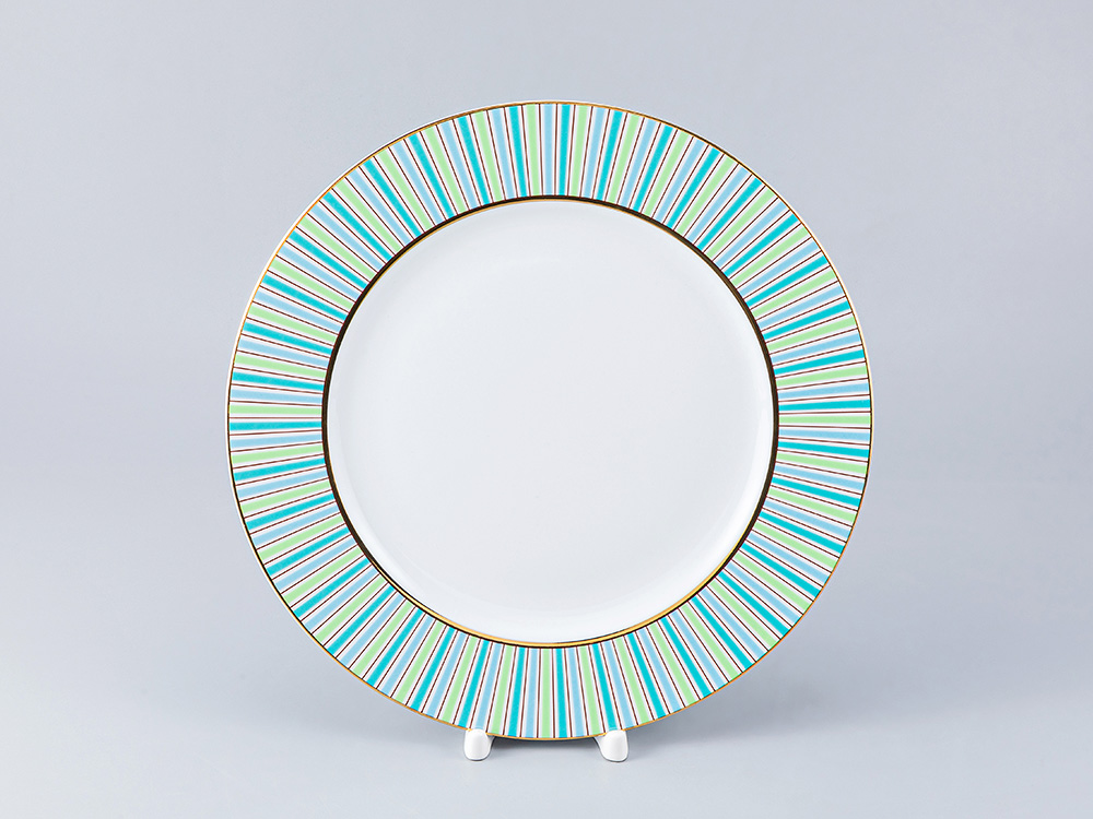Свежий, весенний рисунок «Дублин» организовал изящный дуэт с формой «Банкетная» С.Е. Яковлевой. Элементы узора – полоски и горошинки – голубого, зеленого и синего цвета напоминают о национальном цвете Ирландии и о том, что Дублин – главный порт страны. Золотая отводка, которая идет по горлу сервизных штук, по хватку крышек, по кончику носика чайника и по краю блюдца, завершает композицию.