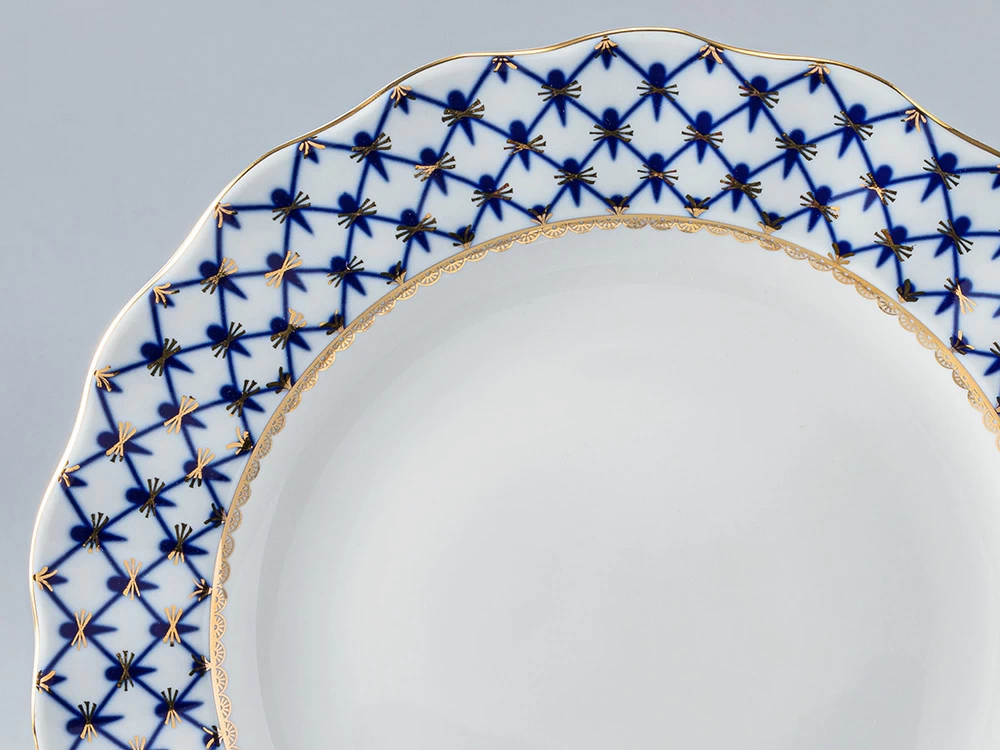 Тарелка подстановочная рис. Кобальтовая сетка изготовлена на Императорском фарфоровом заводе из твердого фарфора с элементами ручной росписи. Автор рисунка - Яцкевич А.А. Диаметр изделия - 273 мм.