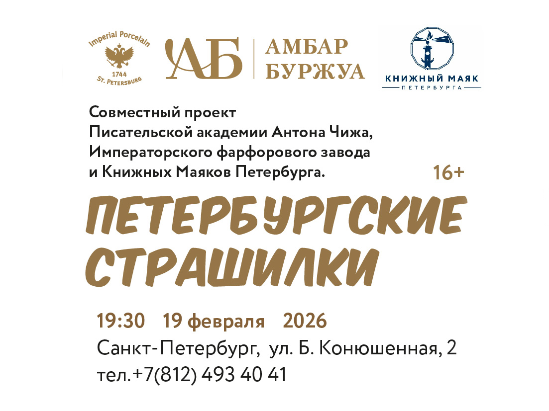 Проект «Петербургские страшилки» – возрождение истинно петербургской традиции страшных «ночных чтений», которые были популярны в Петербургских салонах в конце XIX – начале XX века. «Петербургские страшилки» это совместный проект Писательской академии Антона Чижа, Императорского фарфорового завода и ФД «Книжные Маяки России».