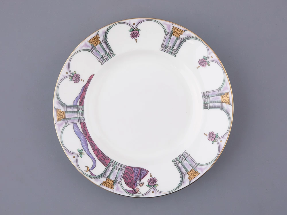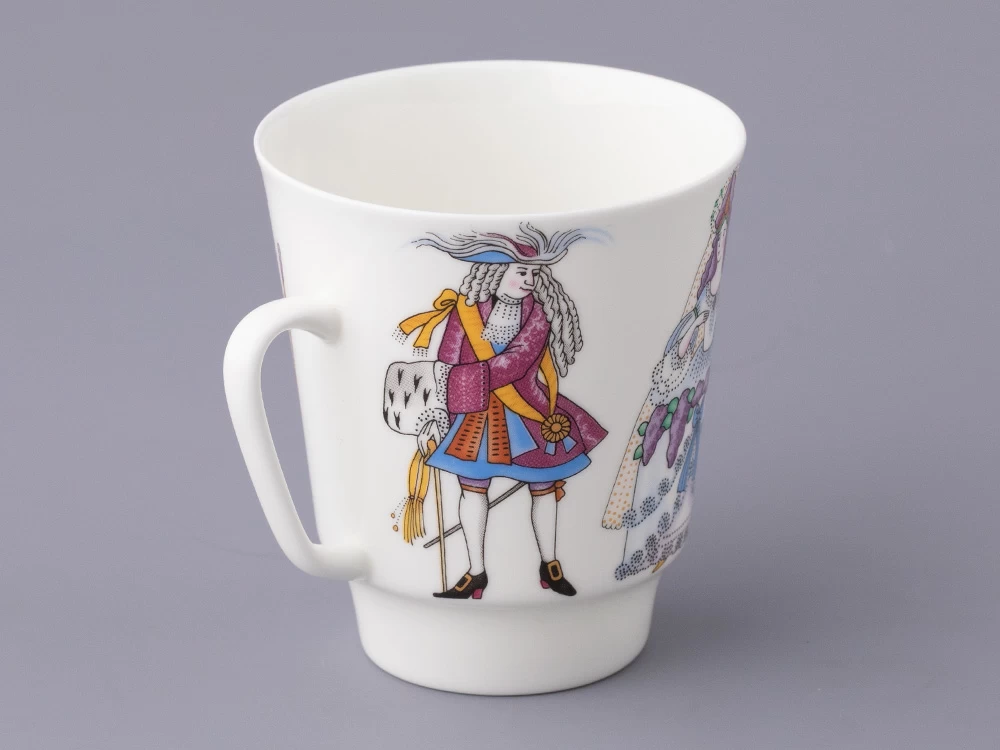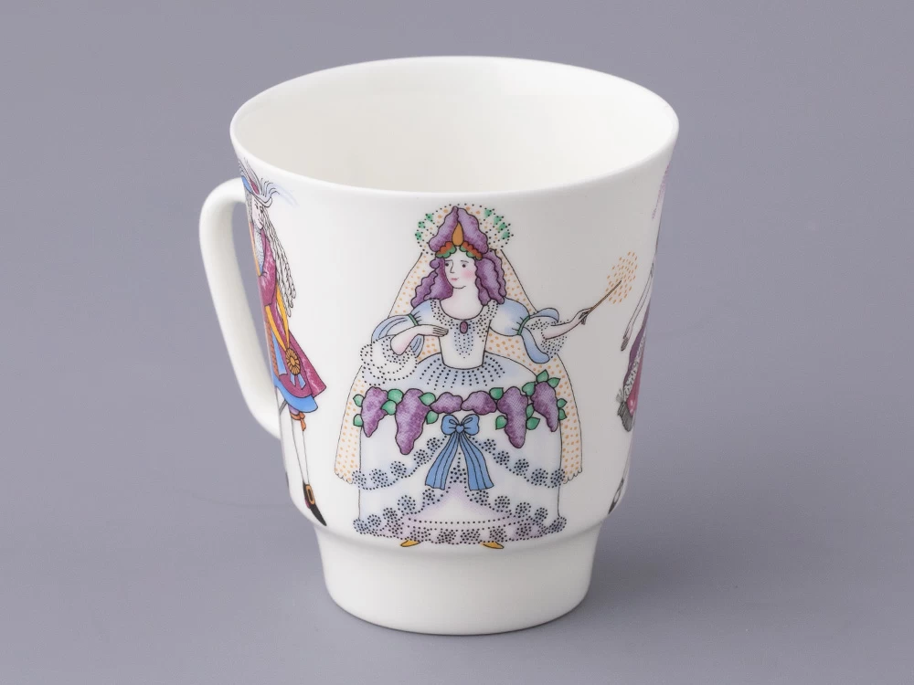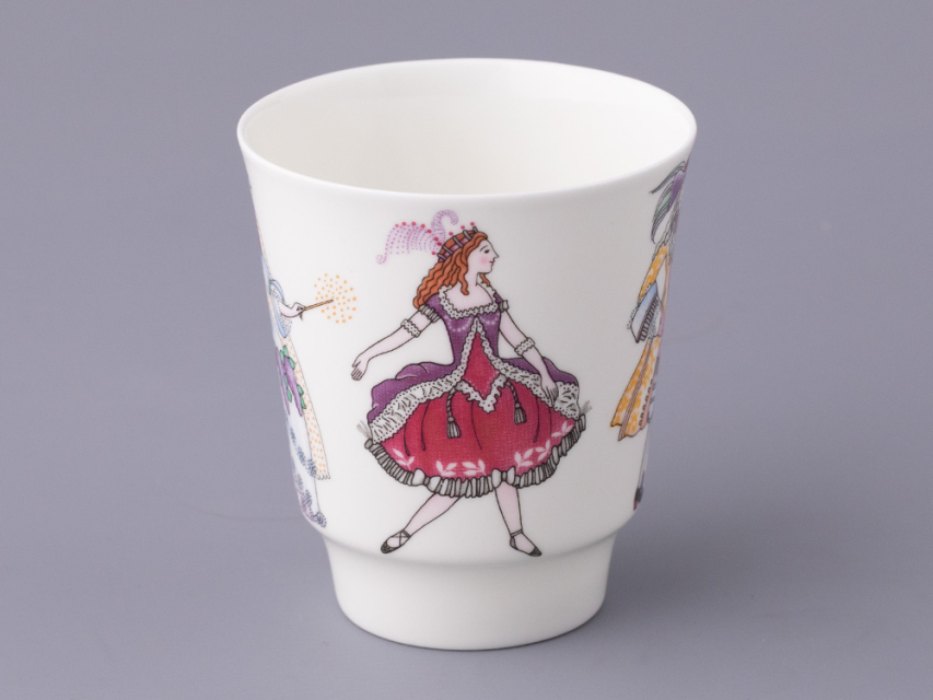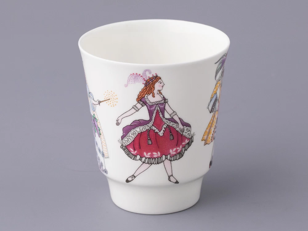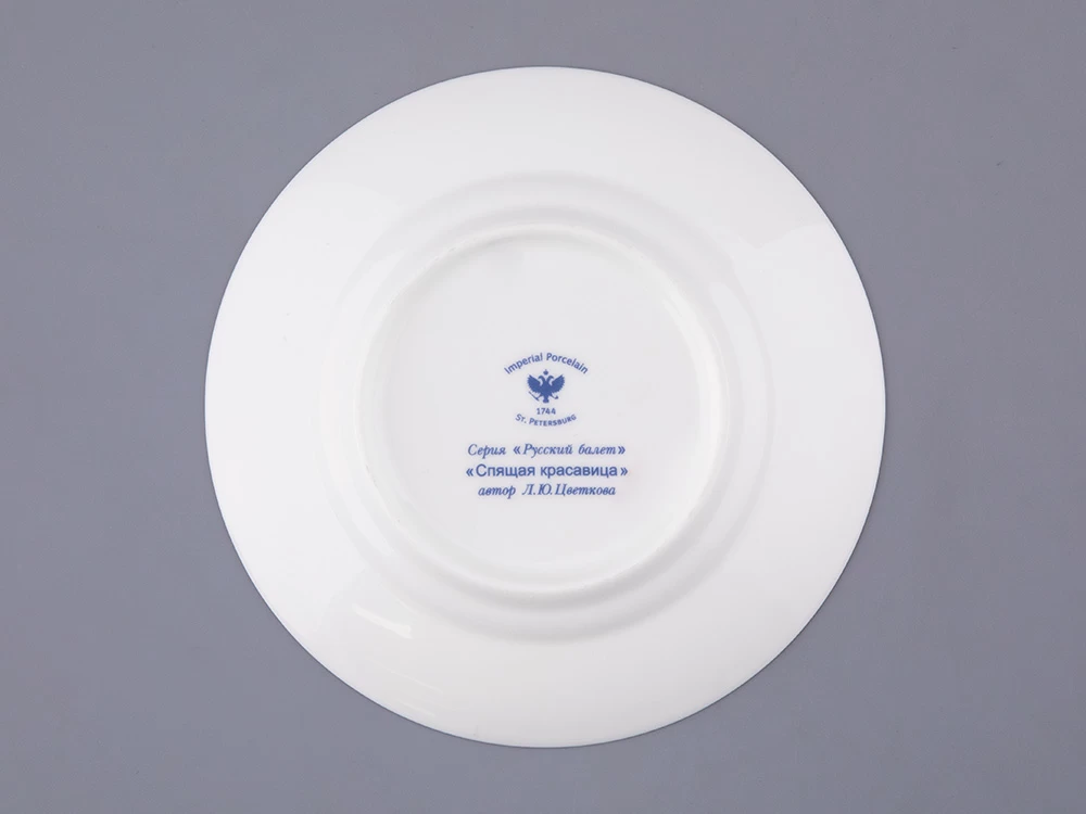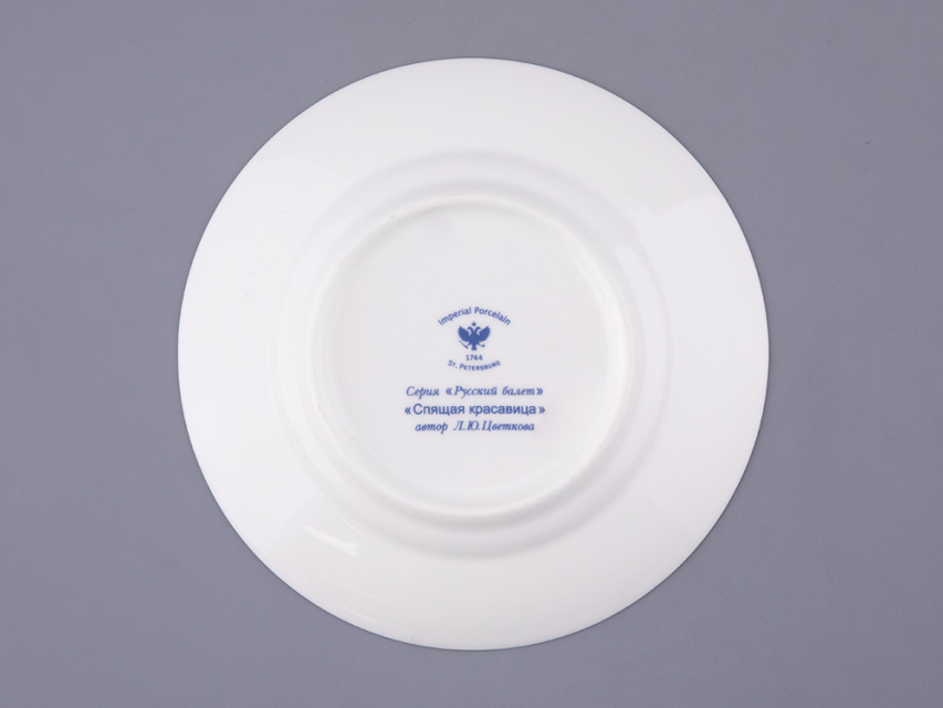 Росписи серии «Русский балет», куда вошел трехпредметный комплект Спящая красавица, созданы по мотивам самых значительных русских балетных спектаклей. Балет «Спящая красавица» Петра Чайковского пользуется неизменной популярностью, его сюжет, повествующий о борьбе тьмы и света, силе любви, находит множество поклонников по всему миру. Этот шедевр стал для Льва Бакста последней крупной постановкой. В 1920-е годы художником было выполнено более 200 эскизов для более 100 костюмов для этого зрелищного спектакля. Декор фарфорового комплекта выполнен по мотивам эскизов Бакста: наряды персонажей отличаются пышностью и нарядностью, с тщательной проработкой деталей.
