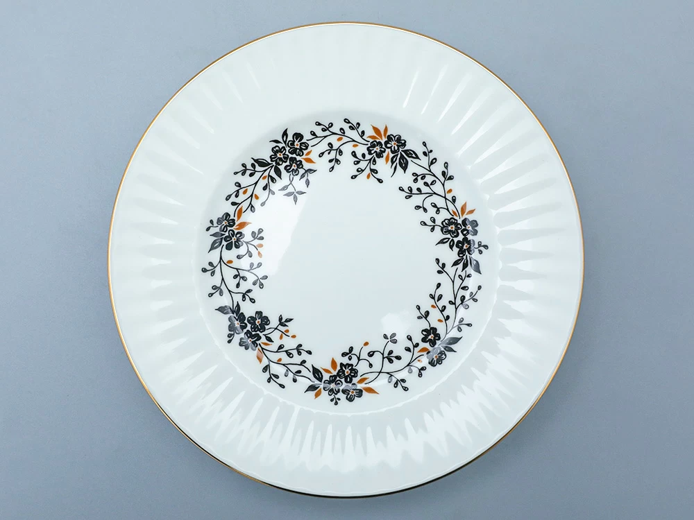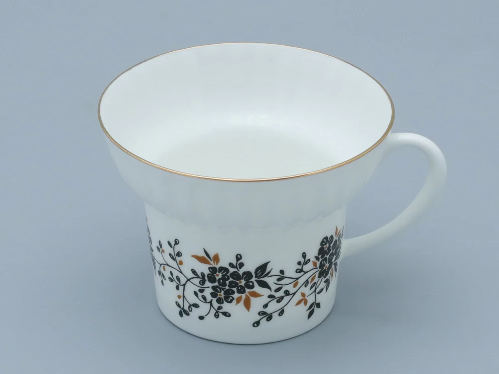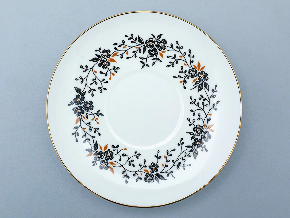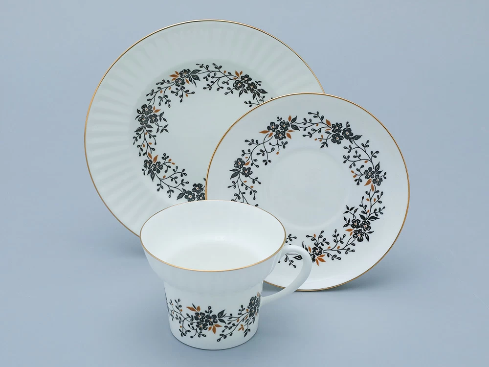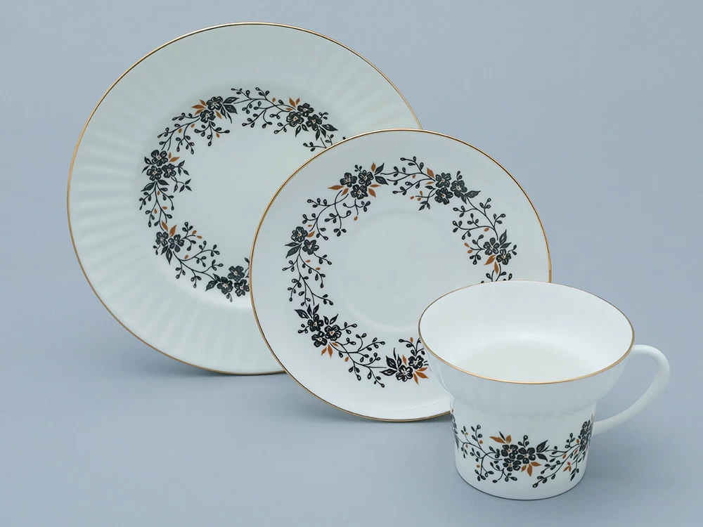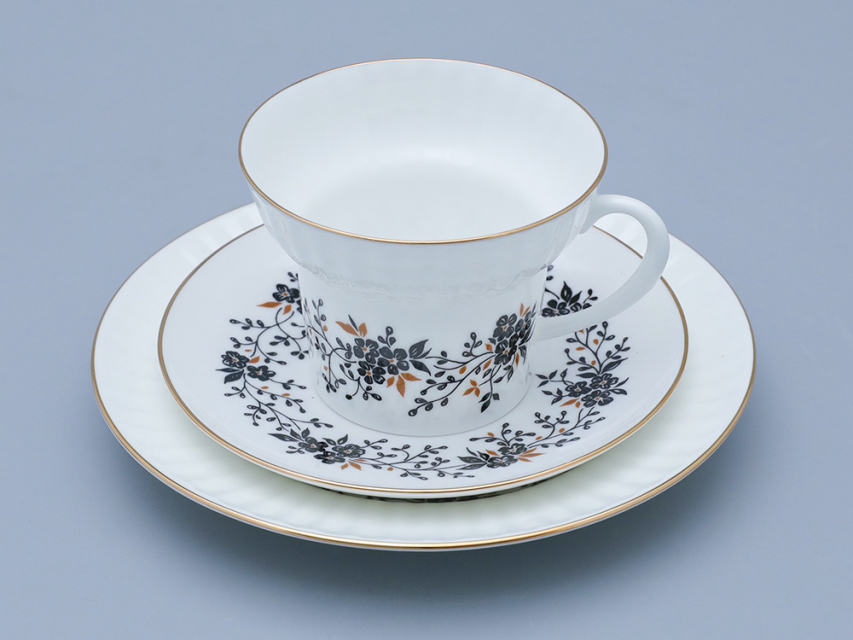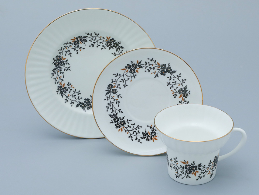 По верху сахарницы, чайника и сливочника, на зеркальце тарелки, блюдца и сухарницы, а также по борту чашки изображены мелкие черные цветочки на тонких веточках с маленькими черными и золотистыми листочками.
