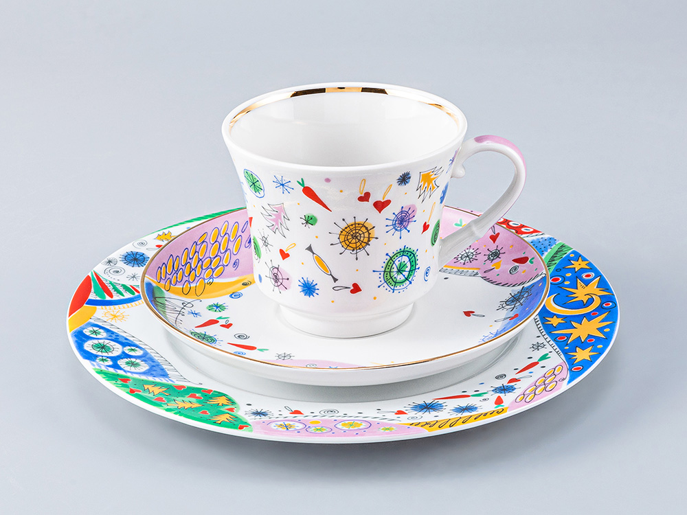 Трехпредметный комплект предназначен для украшения праздничного новогоднего стола: насыщенный цвет и яркие краски росписи изделий подчеркивают праздничное настроение. Главные атрибуты новогоднего торжества, изображенные на белоснежной поверхности фарфора, – украшения для новогодней елки и разнообразные орнаменты, навевающие мысли о празднике, подчеркивают назначение чайного комплекта и делают его прекрасным подарком к Новому году.