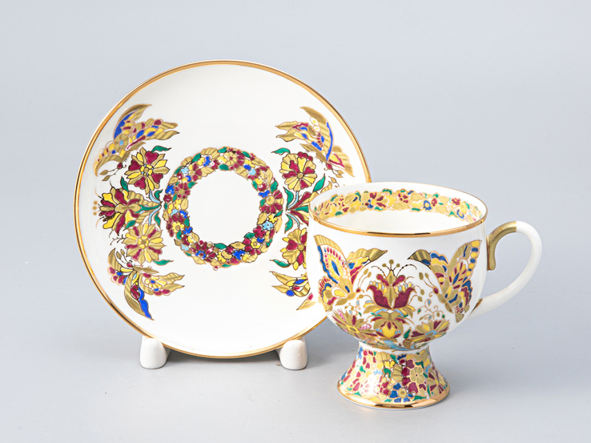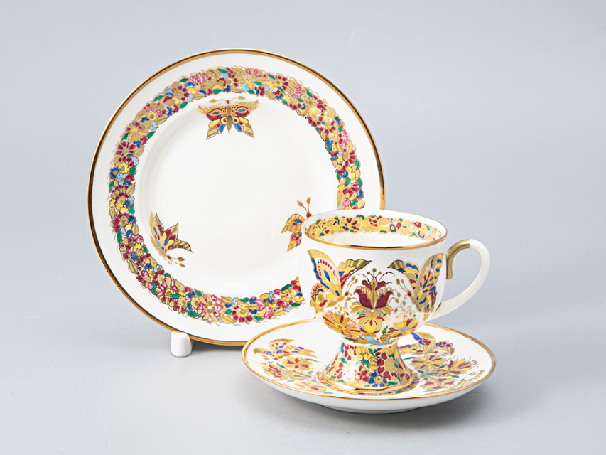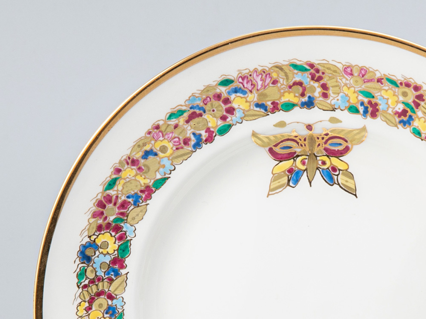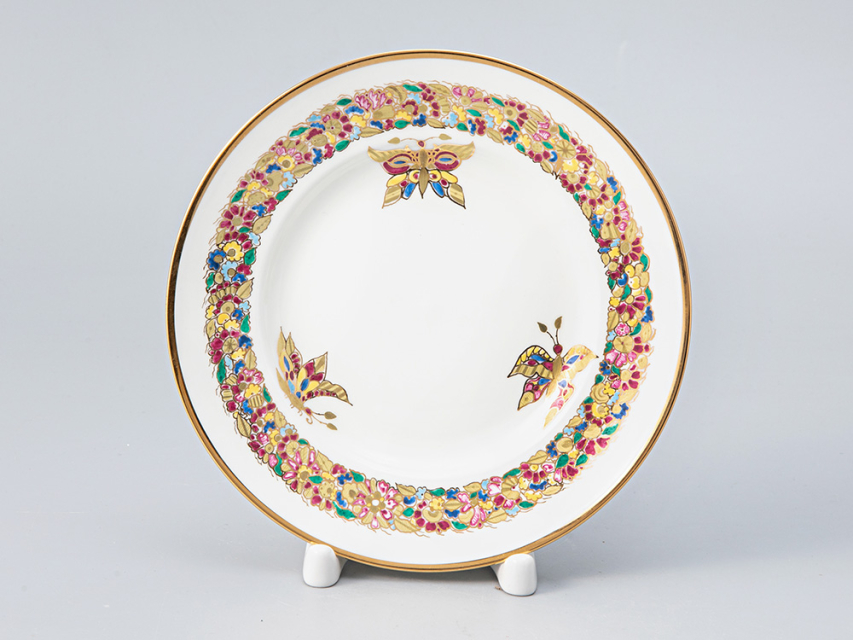 Изделия созданы по рисункам народного художника России А.В. Воробьевского. Драгоценная ювелирная роспись изделия с изображением бабочек, порхающих среди стилизованных цветов, деликатно обыгрывает белоснежную поверхность фарфора, подчеркивая хрупкость и воздушность материала. Изысканные, эмоционально образные росписи А. Воробьевского на предметах из костяного тонкостенного фарфора составляют бесценную коллекцию маленьких шедевров подлинного искусства и высочайшего мастерства.