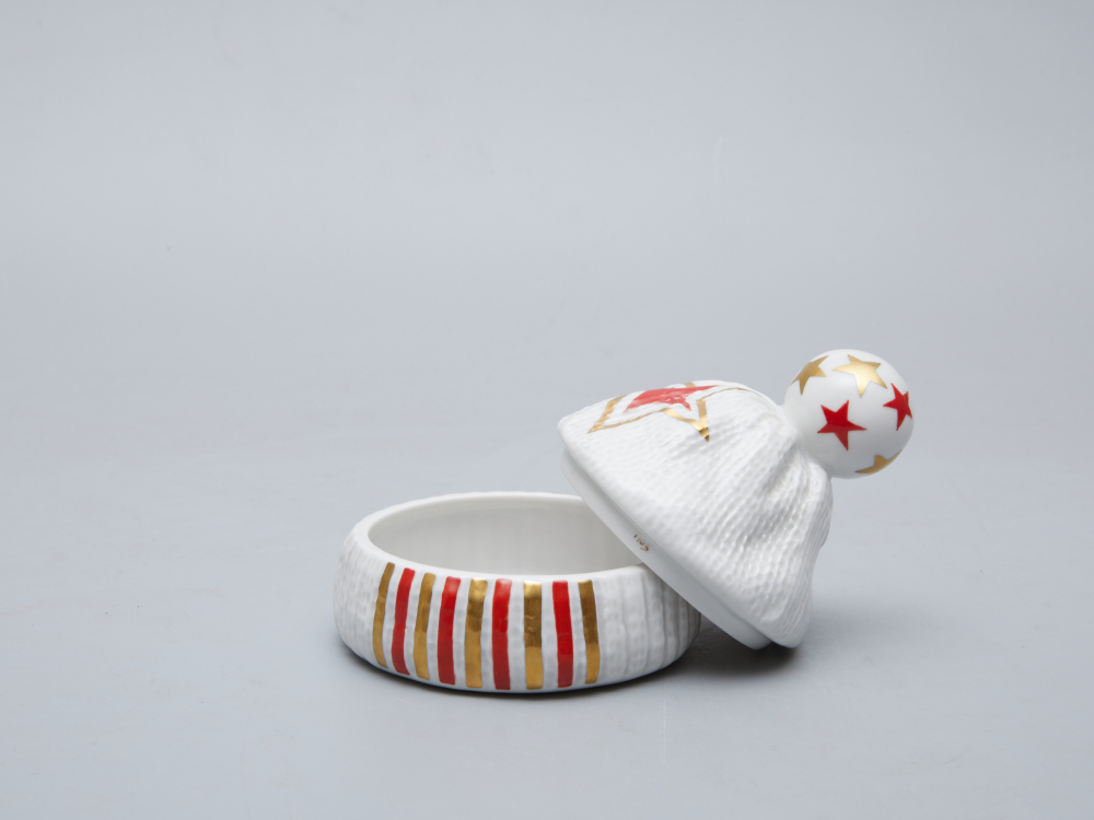 Туалетная коробочка изготовлена на Императорском фарфоровом заводе из твердого фарфора. Для декорирования используется подглазурная деколь, роспись золотом. Автор рисунка - Анна Трофимова, автор формы - Галина Белаш. Выпуск изделия начался в 2020 году. Высота - 10 см. Детские шапочки с помпонами вдохновили Галину Белаш на создание очаровательных туалетных коробочек, будто «связанных» из фарфора.