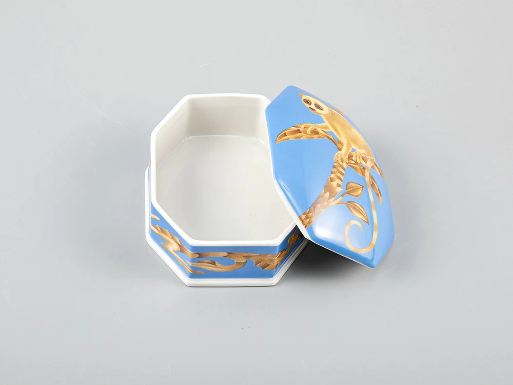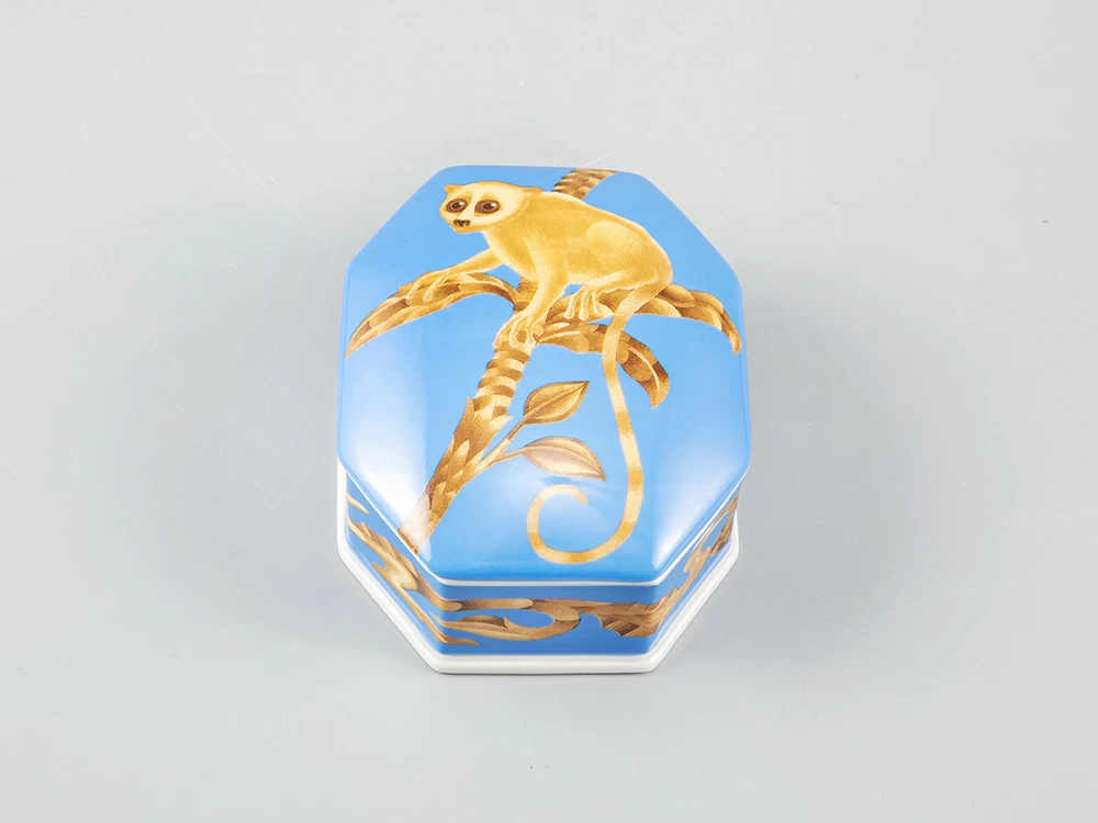 Kirill Ovchinnikov – это российский бренд, под которым выпускаются шелковые платки, посуда, одежда, ювелирные изделия, кафельная плитка, фарфор, обои и многое другое. Художник Кирилл Овчинников разрабатывает декор, который одинаково выигрышно смотрится как на крупных интерьерных объектах, так и на камерных предметах. В коллаборации с Императорским фарфоровым заводом были разработаны туалетные коробочки и чайные пары с одной из наиболее востребованных композиций автора. Изделия украшает изображение лемура – небольшого примата, обитающего на Мадагаскаре.