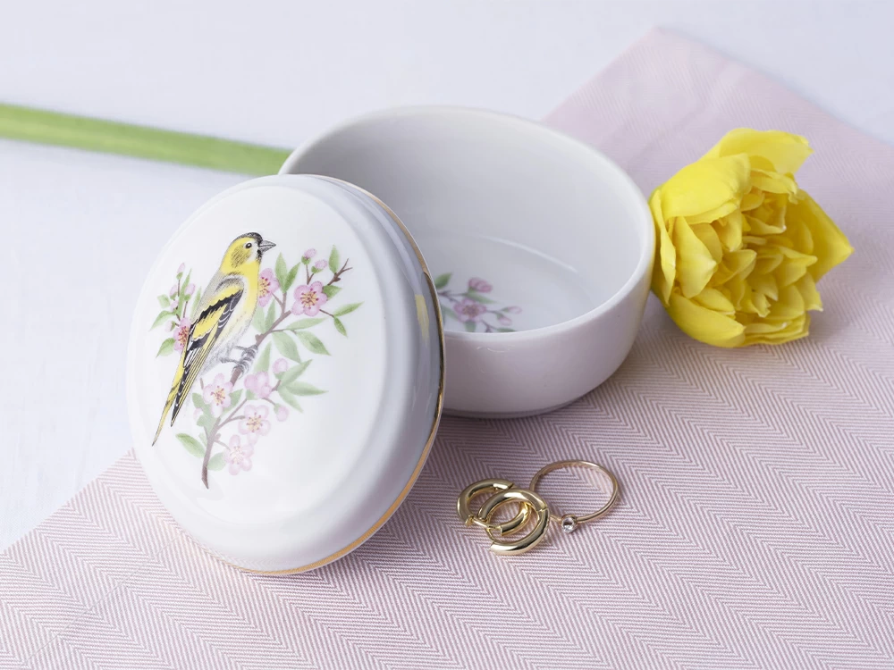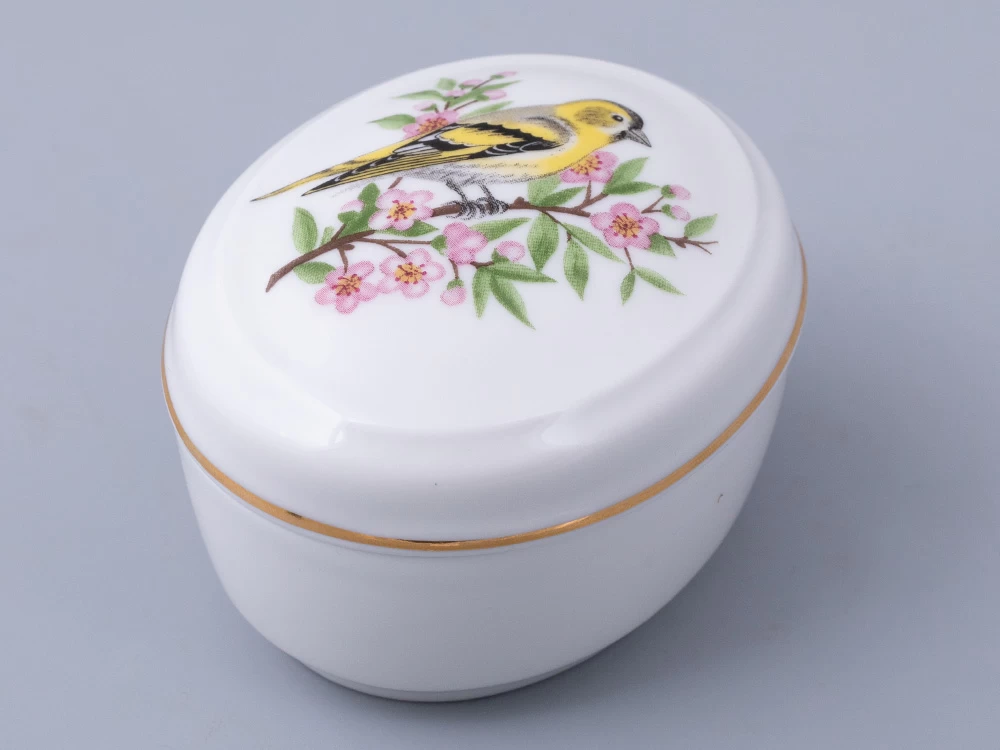 Туалетная коробочка «Чижик» – маленький фарфоровый шедевр, созданный для любования и украшения интерьера. На крышке туалетной коробочки изображена певчая птичка – символ весны и пробуждения природы. Такая изысканная работа служит оригинальным и практичным украшением туалетного столика или дополнением к декору интерьера.