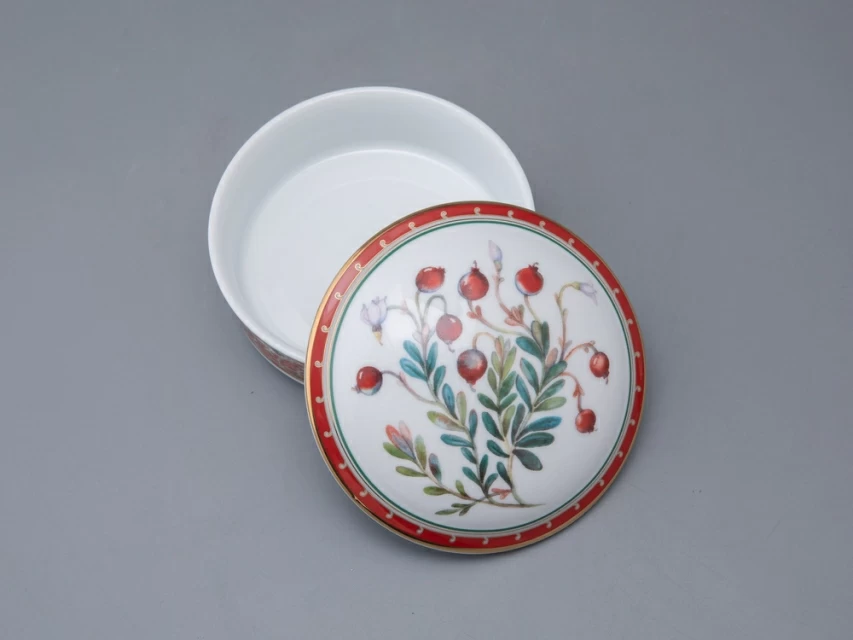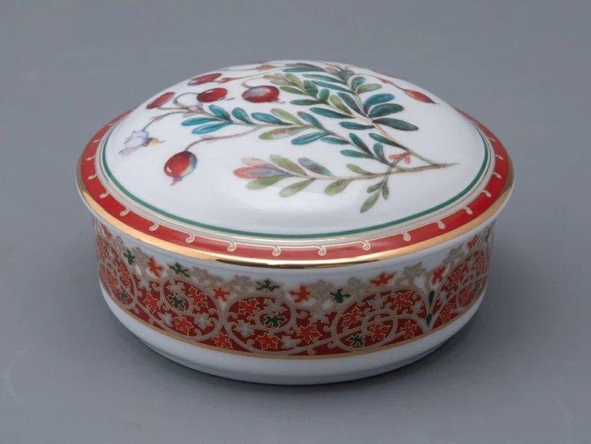 Туалетная коробочка «Клюква заповедная» вошла в продолжение коллекции «Цветы и ягоды России» от художника Ольги Будашовой. В своих работах автор зачастую изображает цветы и дары природы, – такой декор остается вне времени. Используя растительные мотивы, Ольга Будашова создает предметы, которые сочетают в себе искусство и практичность. Композиция на фарфоре, выполненная в эстетике винтажных ботанических иллюстраций, дополнена орнаментальным узором – авторским размышлением на тему национальной вышивки.