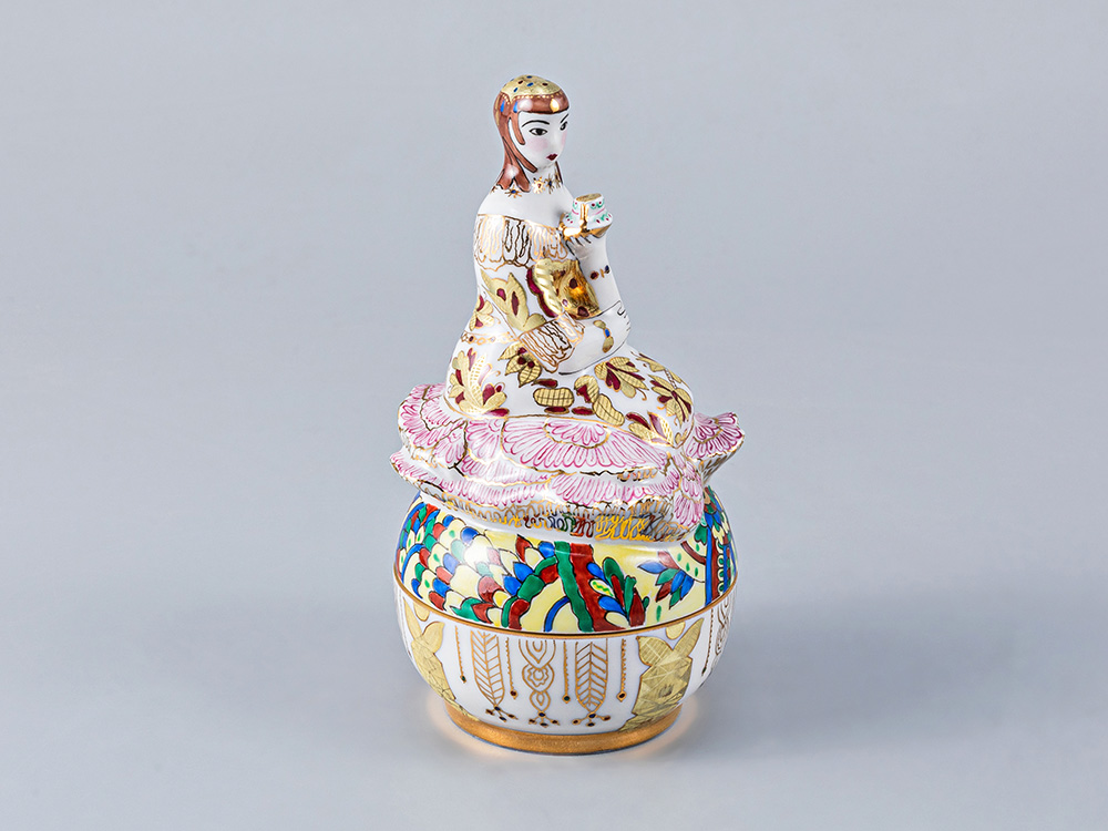 Декорирование выполнено ручным способом, надглазурными красками и з/с препаратом. На круглой коробочке сидит, подогнув ноги под себя, молодая женщина. Складки и воланы подола платья широко раскинуты округ ног. Правая рука согнута в локте, поддерживает под локоть левую руку, которая держит у груди чашку на блюдце. Голова чуть повёрнута вправо. Роспись верха коробочки имитирует орнамент восточного ковра.