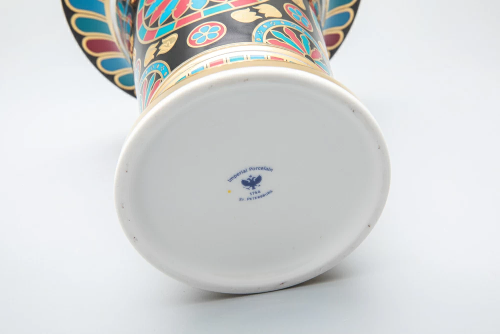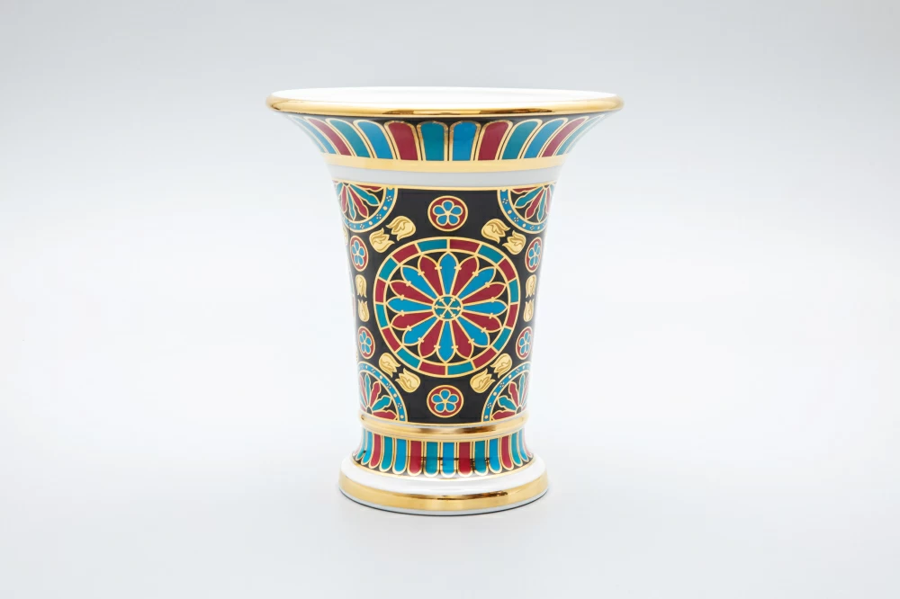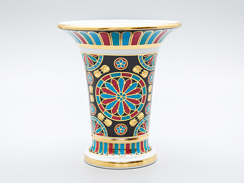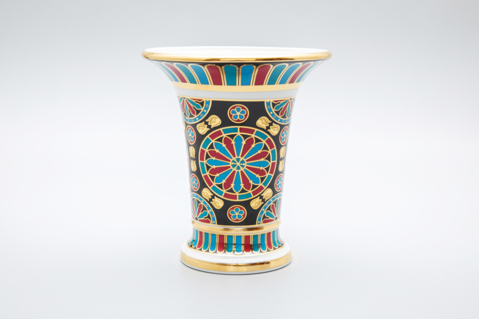 Основой для оформления современной коллекции ваз послужила историческая серия «Готических» тарелок для десерта, изготовленная в 1831 году на Императорском фарфоровом заводе в дополнение к Собственному сервизу дворца Коттедж. Витражное окно - «роза», характерный элемент готических храмов, стало основным мотивом декора.