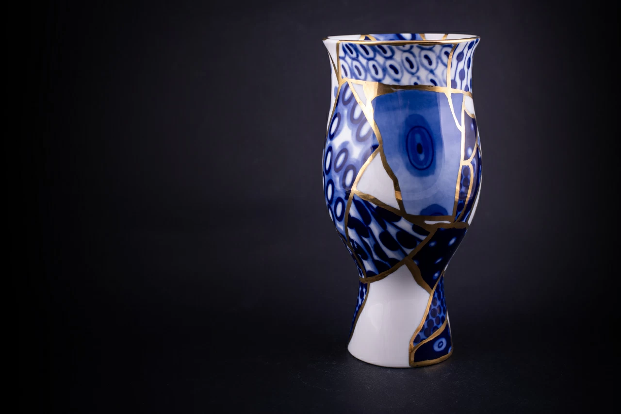 Ваза входит в коллекцию «Байкал» от художника Веры Бакастовой. На создание декора автор вдохновило искусство Кинцуги (яп. «золотая заплатка») – техника реставрации керамических изделий с помощью лака, смешанного с золотым, серебряным или платиновым порошком.