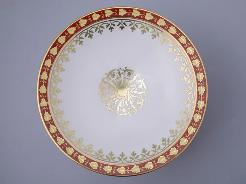Фаза для фруктов изготовлена на Императорском фарфоровом заводе из твердого фарфора. Для декорирования используется ручная роспись. Авторский оригинал хранится в коллекции Государственного Эрмитажа.