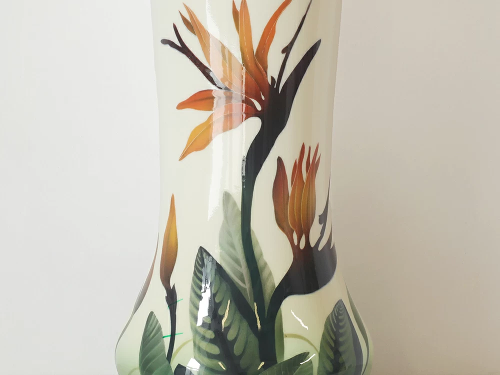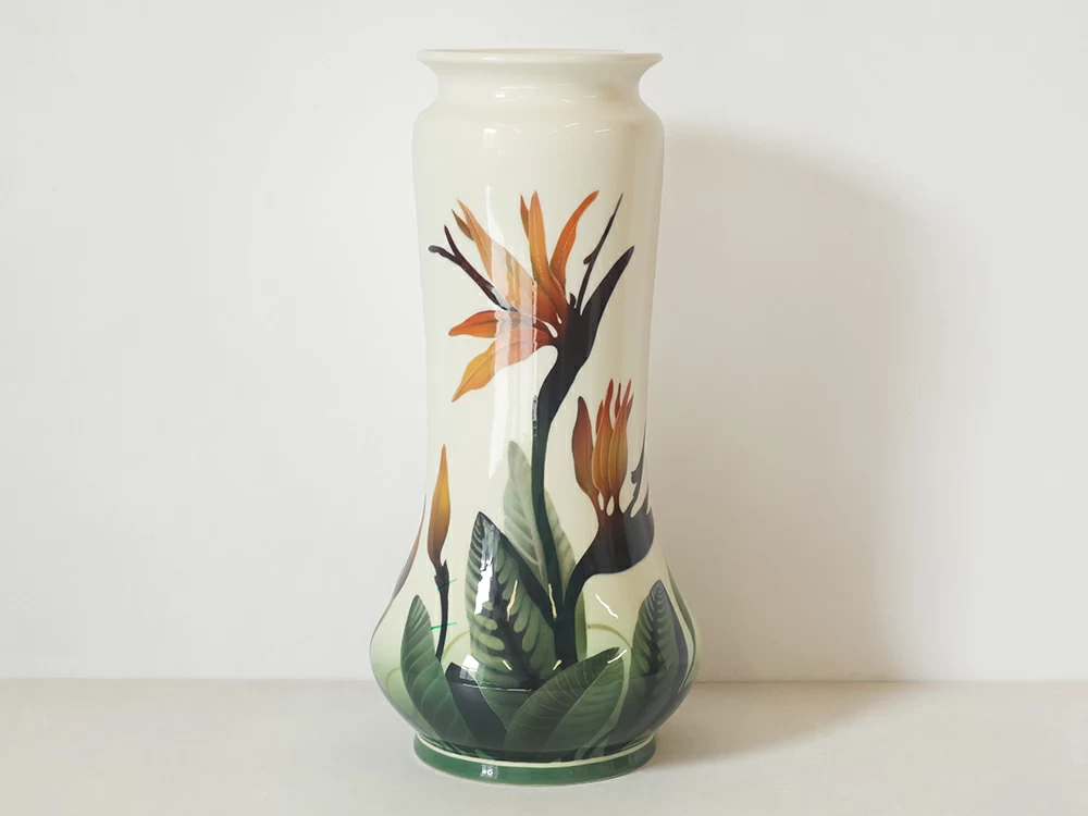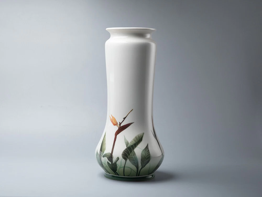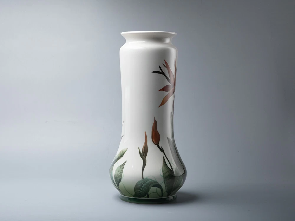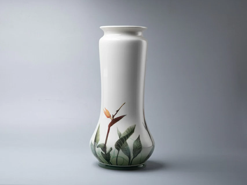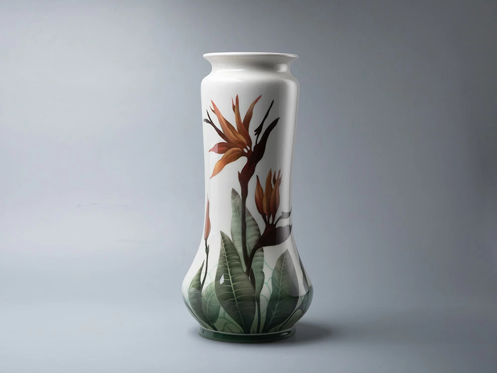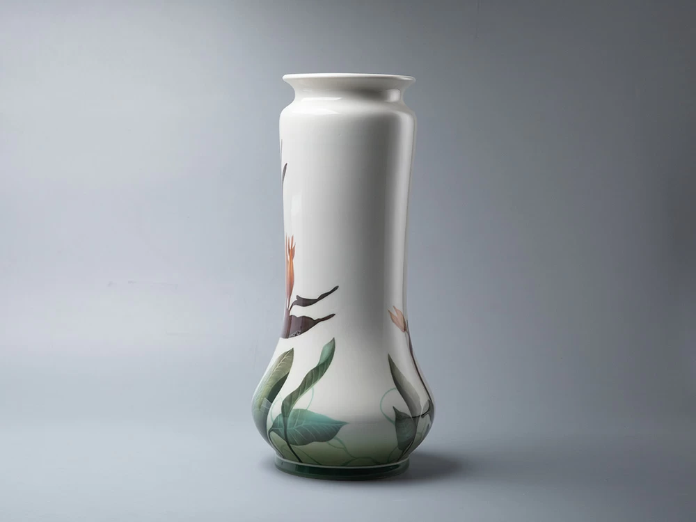 Ваза «Стрелиция» продолжает живописные традиции Императорского фарфорового завода конца XIX – начала XX века. Автор использует подглазурную роспись – «визитную» карточку первого фарфорового производства России. Главным мотивом композиции стал цветок стрелиции, известный как «райская птица», чьи графичные линии и нежные переходы цвета придают вазе современный облик.