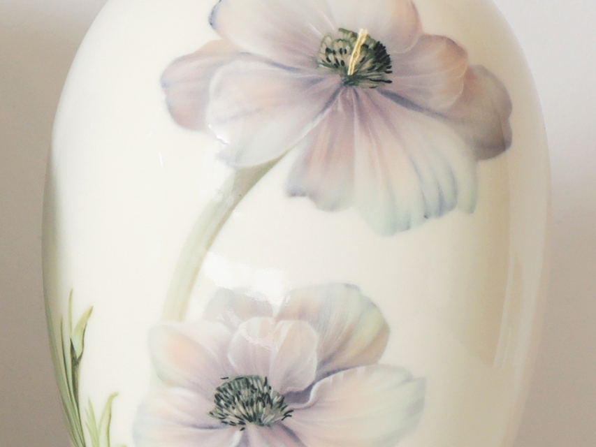 Автор росписи Татьяна Чапургина украсила поверхность нежными анемонами: белые лепестки с зелеными листьями выполнены вручную подглазурным методом, что гарантирует стойкость красок.