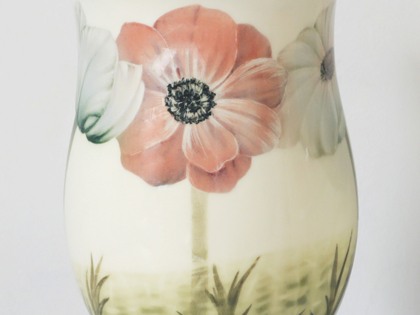 Автор росписи Татьяна Чапургина украсила поверхность нежными анемонами: белые лепестки с зелеными листьями выполнены вручную подглазурным методом, что гарантирует стойкость красок.