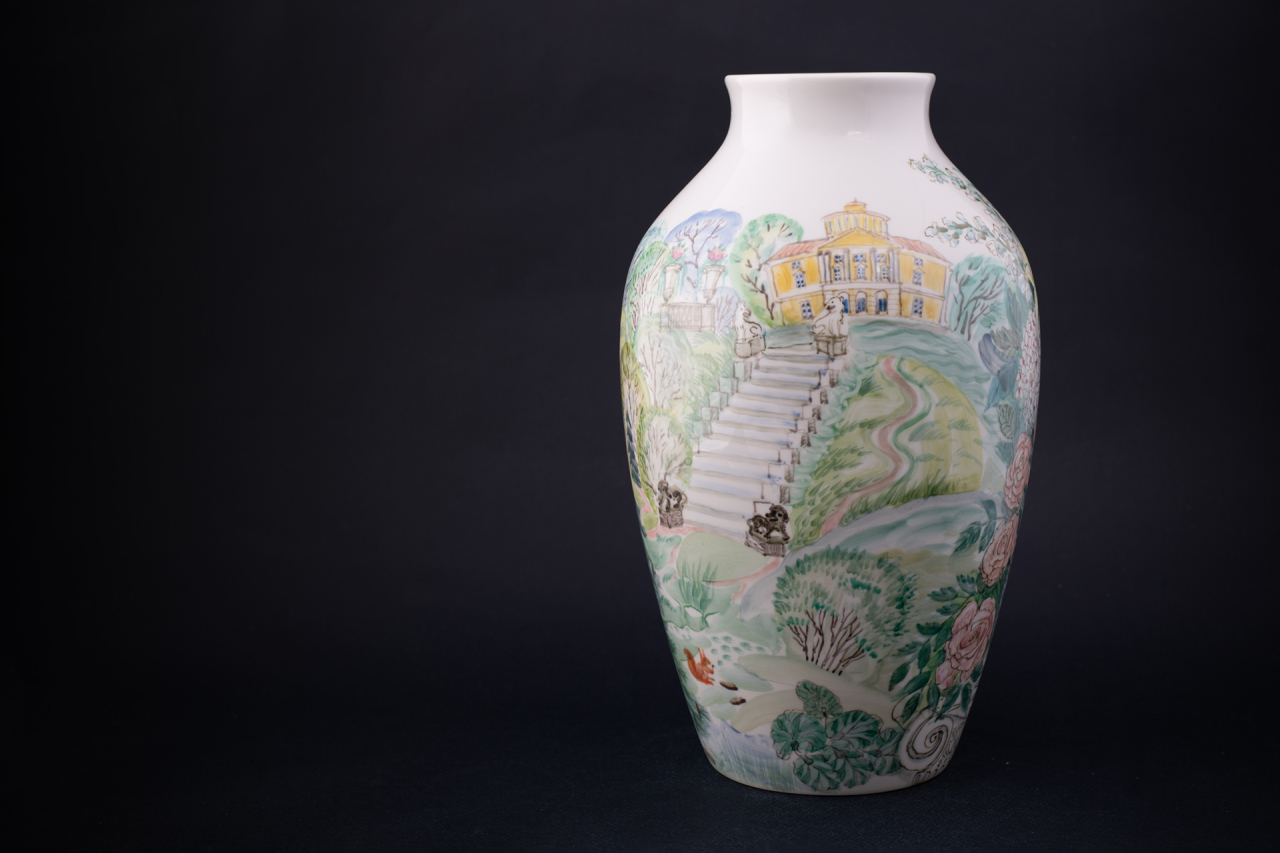 Ваза «Императорский букет» – это масштабное живописное полотно на фарфоре, воспевающее красоту Павловского дворцово-паркового ансамбля. Анна Каждан мастерски использует форму изделия для создания панорамного вида, в котором архитектурные шедевры органично переплетаются с пышным цветочным декором. Роспись вазы представляет собой сложную многоплановую композицию. На одной стороне перед зрителем открывается вид на классические павильоны и мостики Павловска, виртуозно прописанные в акварельной манере. Другая часть тулова отдана под роскошный букет, давший название работе: нежные гортензии, лилии и розы словно вырастают из парковых аллей. Насыщенная палитра с преобладанием изумрудных, лазурных и розовых оттенков создает ощущение вечного цветения.