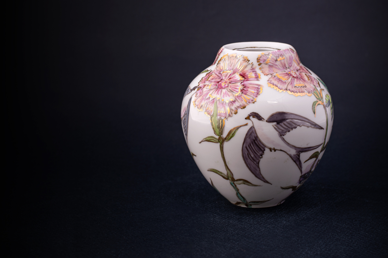 Ваза «Ласточки» – это утонченное произведение из твердого фарфора, в котором петербургский художник Анна Каждан воплощает поэтическую атмосферу весеннего сада. Работа выполнена в камерной манере, сочетающей графическую точность и мягкую акварельность, что характерно для авторского стиля мастера. Центральным мотивом росписи стали ласточки, парящие среди пышных кустов роз. Художник использует деликатную пастельную палитру: припыленные розовые бутоны и оливково-зеленая листва создают фон для динамичных силуэтов птиц. Особую выразительность композиции придают золотые акценты на листьях и оперении, подчеркивающие благородную белизну фарфора. Тонкие линии и мягкие цветовые переходы передают ощущение воздуха и мимолетности момента.