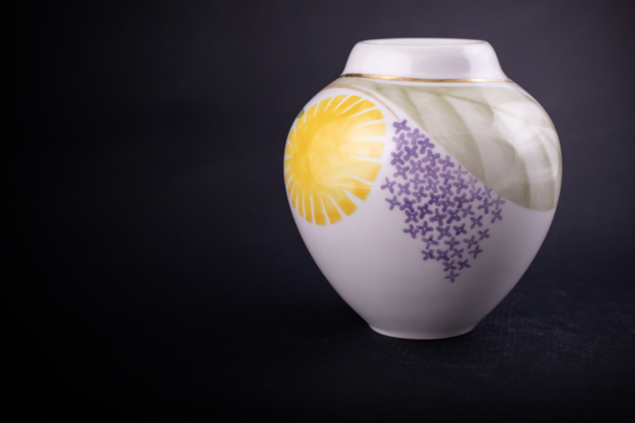 Ваза «Одуванчик» выполнена в технике надглазурной полихромной росписи, в которой узнается индивидуальный почерк художника. Изображение решено в декоративной стилистике, сочетающейся с ботанической точностью деталей. Мягкая, сдержанная гамма и крупный масштаб рисунка подчеркивают лаконичность формы изделия. Автор сознательно прибегает к утонченным полутонам, создавая гармоничное созвучие с безукоризненной белизной фарфора. Этот изысканный выбор наделяет композицию невесомостью и воздушностью, подчеркивая хрупкую красоту мгновения.