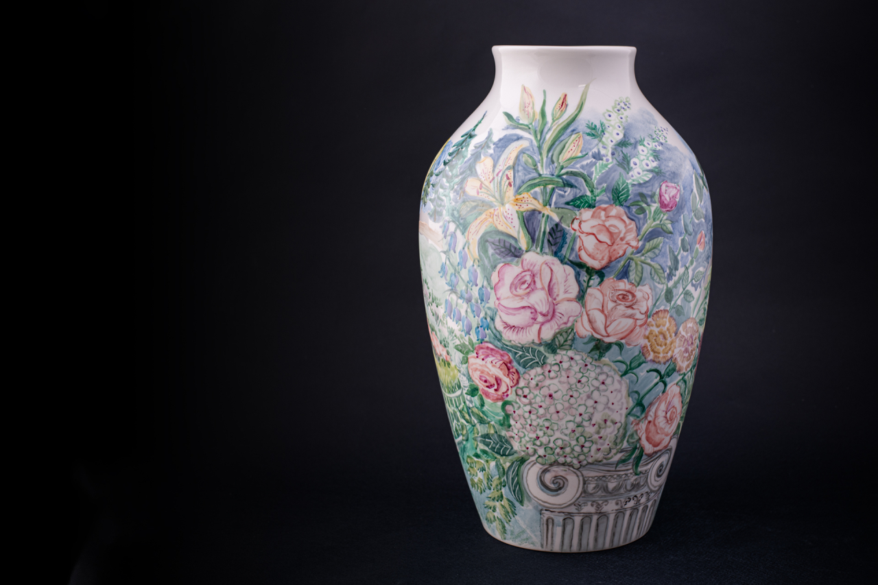 Ваза «Павильон роз» – это живописное посвящение Павловскому парку, одному из самых романтичных мест пригорода Петербурга. Художник Анна Каждан переносит на фарфор атмосферу летнего дня, воссоздавая облик знаменитого павильона в окружении цветущих аллей. Роспись выполнена в узнаваемой авторской манере, напоминающей классическую акварель. Центральное место занимает изображение Розового павильона – памятника архитектуры классицизма, утопающего в зелени и цветах. Палитра вазы наполнена свежими природными оттенками: нежной охрой стен, сочной зеленью парка и розовыми штрихами цветущих кустов. Тонкая проработка архитектурных деталей и садовых дорожек создает эффект погружения в пространство пейзажа.