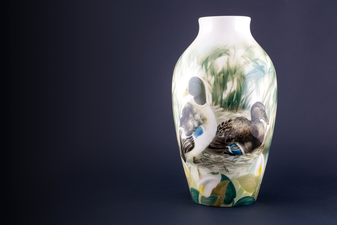 Ваза изготовлена на Императорском фарфоровом заводе из твердого фарфора. Форма отливается вручную. Роспись выполнена в уникальной технике подглазурной росписи, блестяще освоенной художниками Императорского фарфорового завода и практически не имеющей аналогов в мире. Под воздействием высокого огня контур рисунка становится слегка размытым, а краски, покрытые сверху глазурью, - приглушенными и многозначительными.