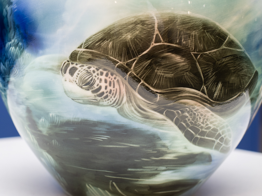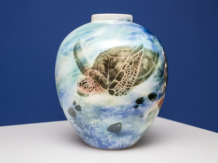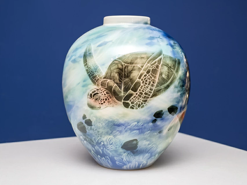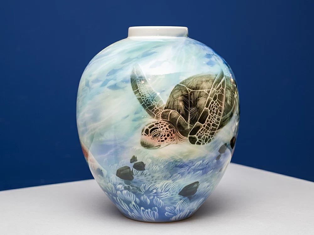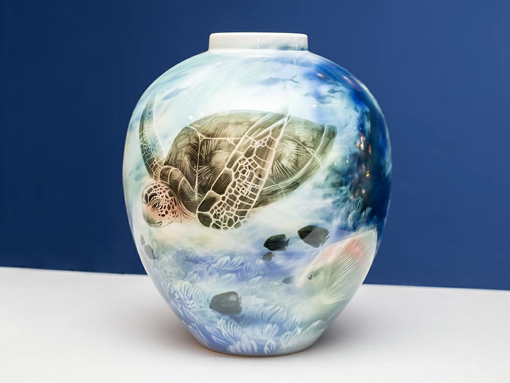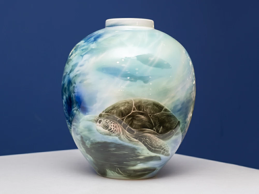 Эта ваза словно приоткрывает завесу над сокровенными тайнами морского царства. Её круглая форма органично дополняет сюжет: на белоснежном фарфоре оживает красочный подводный пейзаж. Неторопливая морская черепаха грациозно скользит среди причудливых водорослей, а чуть дальше — целая россыпь других обитателей глубин.