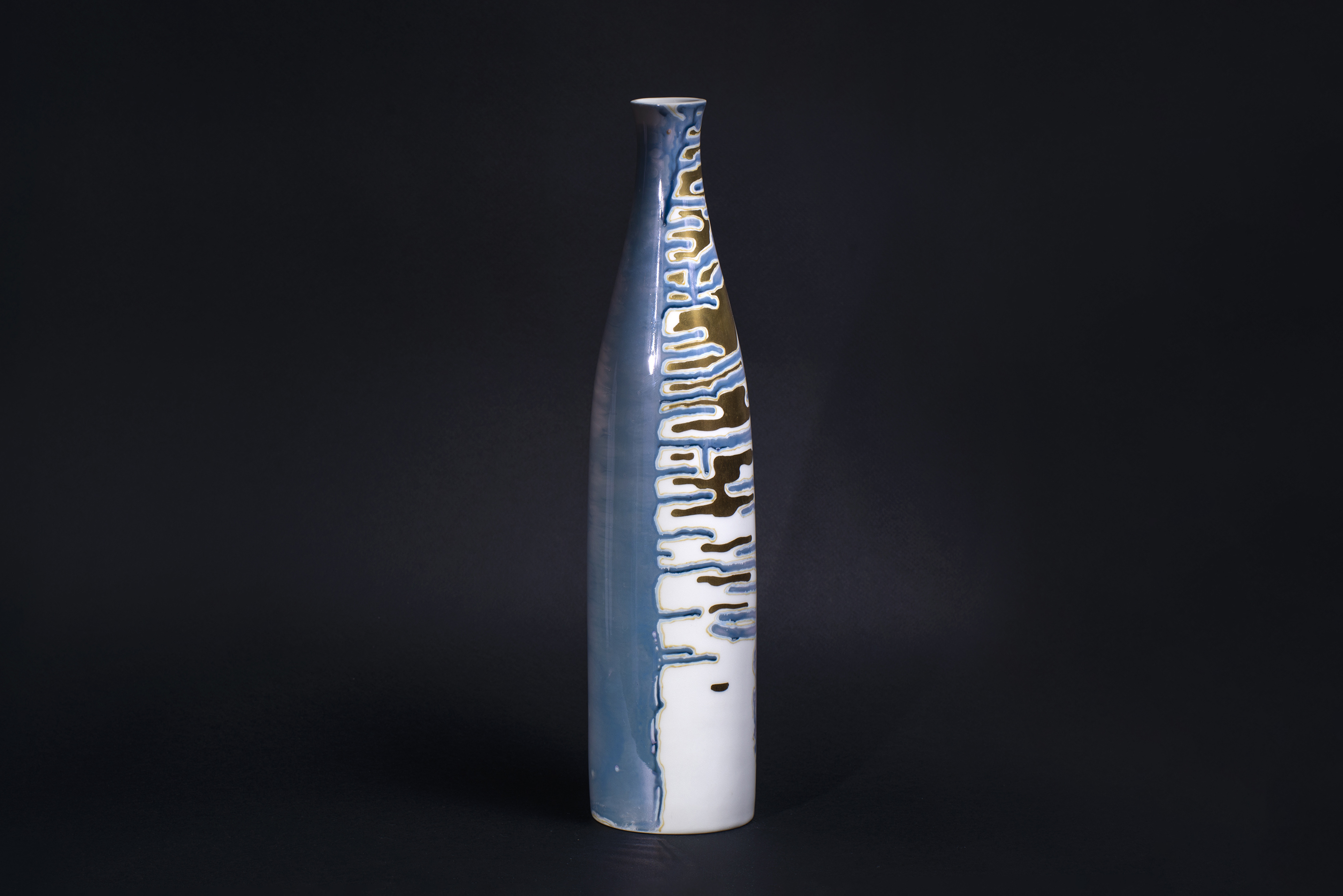 На вазе из композиции «Таяние» нашли свое выражение эффектный декор, созвучный эстетике минимализма, и актуальные тенденции интерьерного дизайна. Юлия Жукова обращается к интересному приему «соавторства» с материалом: позволяя текущей краске создать собственный узор, она на художественном уровне «расшифровывает» его, дополняя линиями и золотыми акцентами. Люстровые краски на белоснежной поверхности рождают ассоциацию с пробуждением природы, что также отзывается в названии.