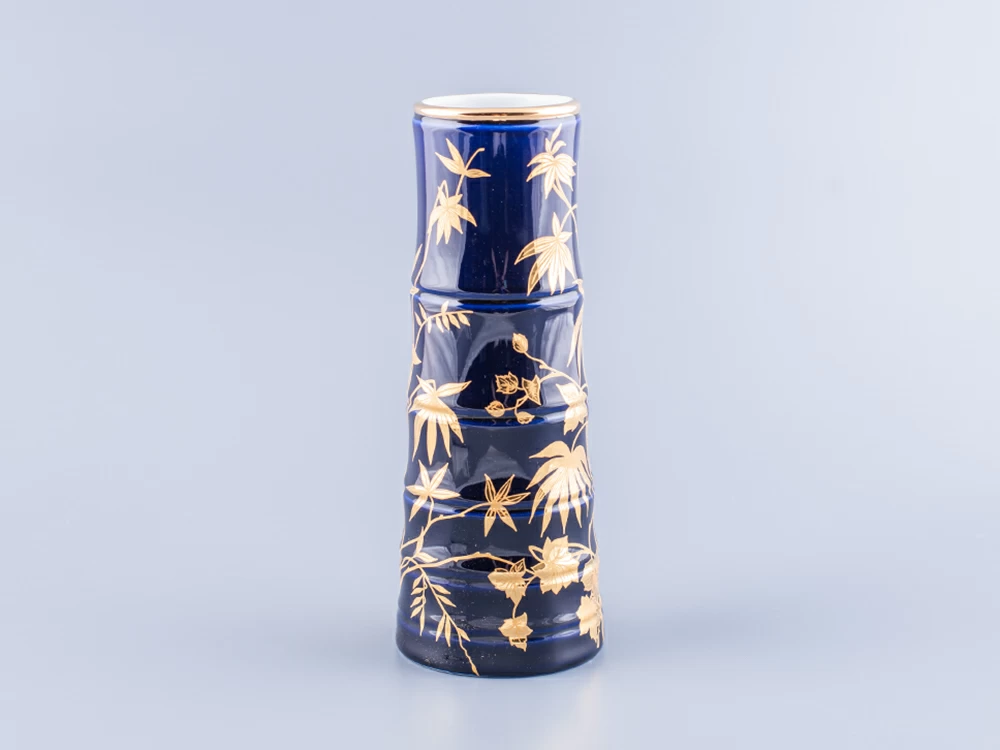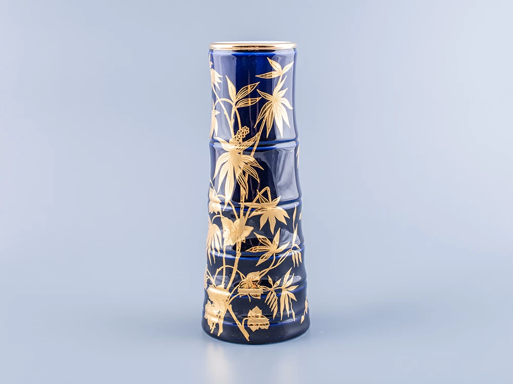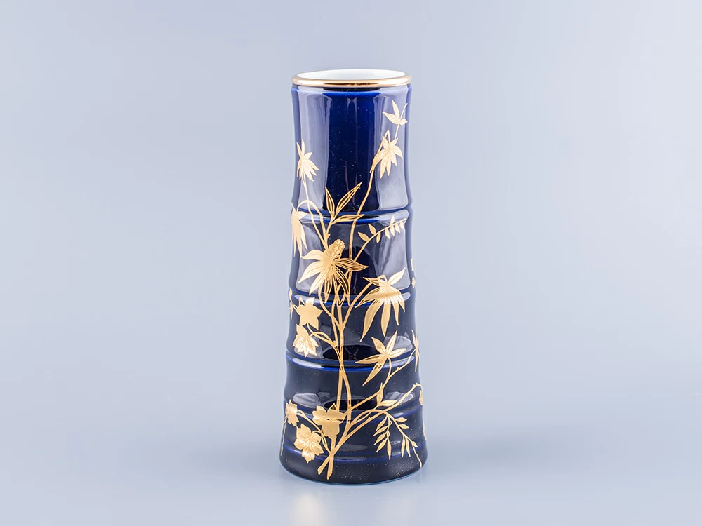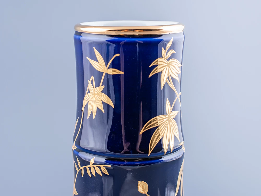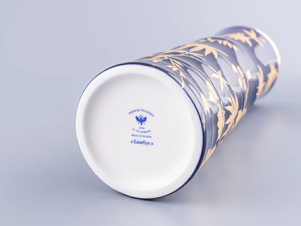 Роспись выполнена в технике подглазурной живописи подглазурной кобальтовой краской с последующей доделкой надглазурной краской и золотосодержащим препаратом. По тулову вазы в сплошном заполнении свободно переплетающиеся стебли бамбука с листьями. Кистью вручную выполнена широкая отводка золотосодержащим препаратом по верхнему краю вазы.