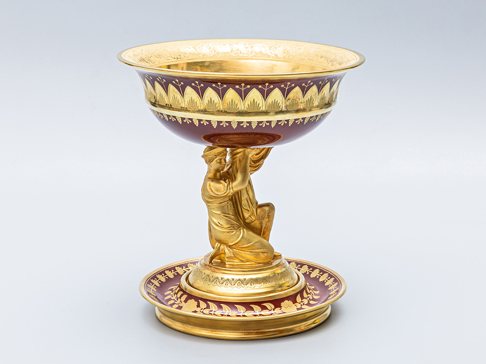 Ваза состоит из 2-х частей: чаши и скульптуры женщины в античной одежде, склонившейся на одно колено. Женщина стоит на круглом плинте, обеими руками держит чашу вазы, приподняв ее вверхРоспись выполнена в технике надглазурной живописи надглазурными красками и золотосодержащим препаратом с цировкой. Внешняя поверхность чаши расписана коричневой краской, по кругу – изображение орнамента. Скульптура женщины, постамент и орнамент на чаше расписаны золотосодержащим препаратом, которым отведен и верхний край чаши. В центре вазы изображение «золотого» цветка. Изделие подписное.