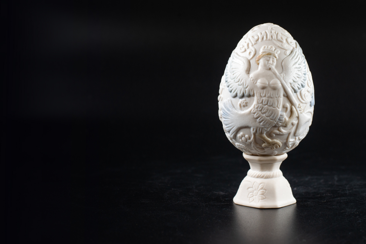 Пасхальное яйцо с подставкой изготовлено на Императорском фарфоровом заводе из твердого фарфора