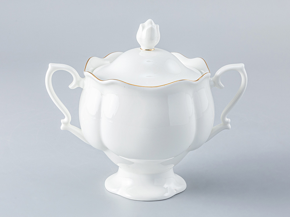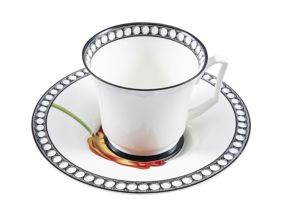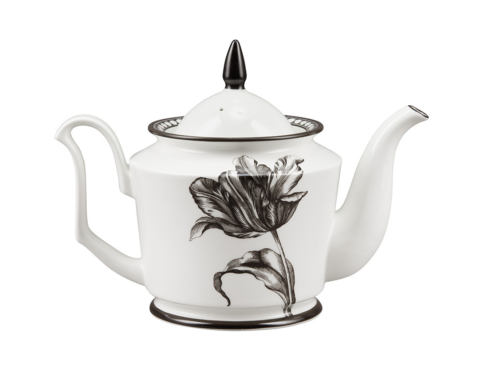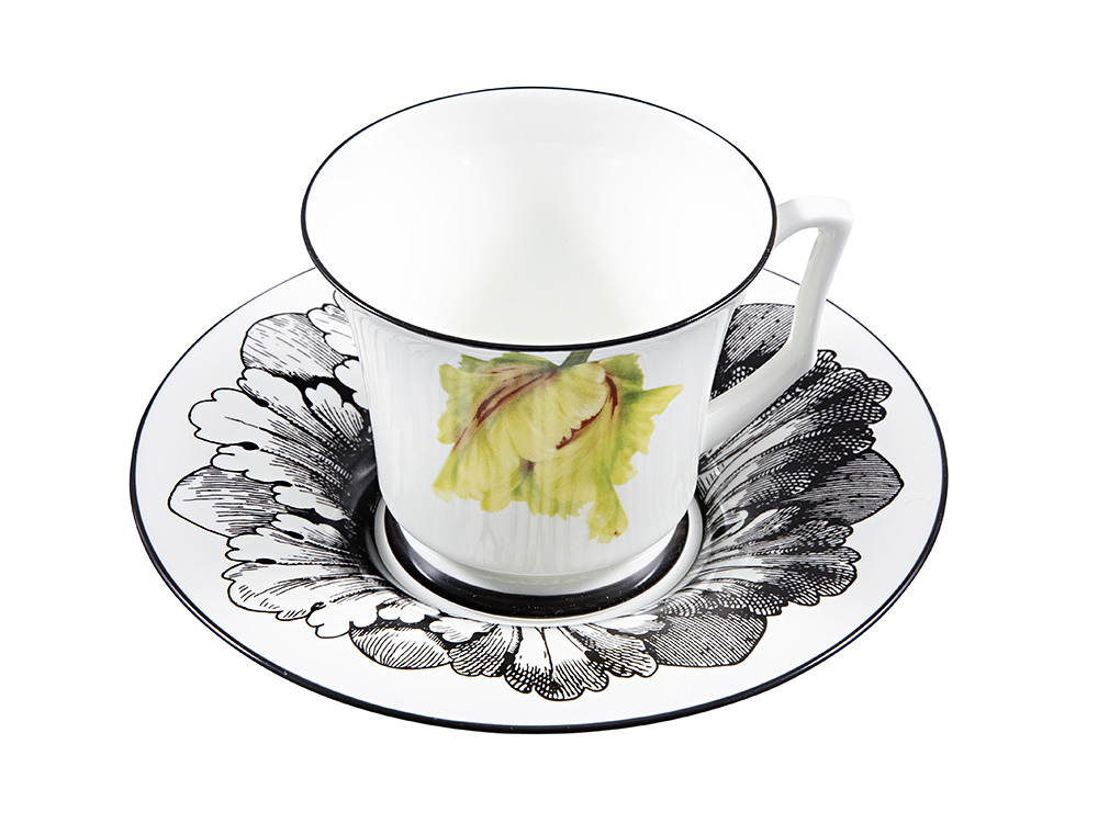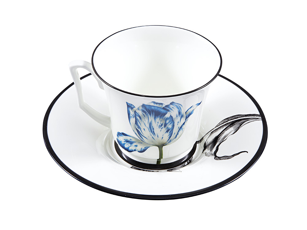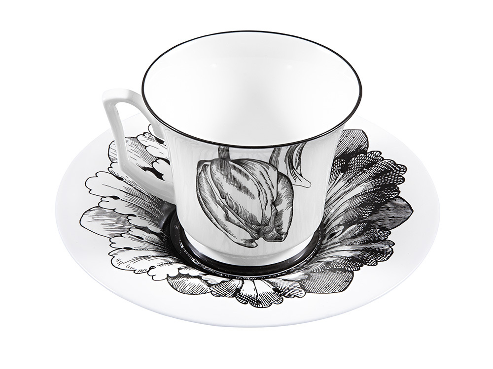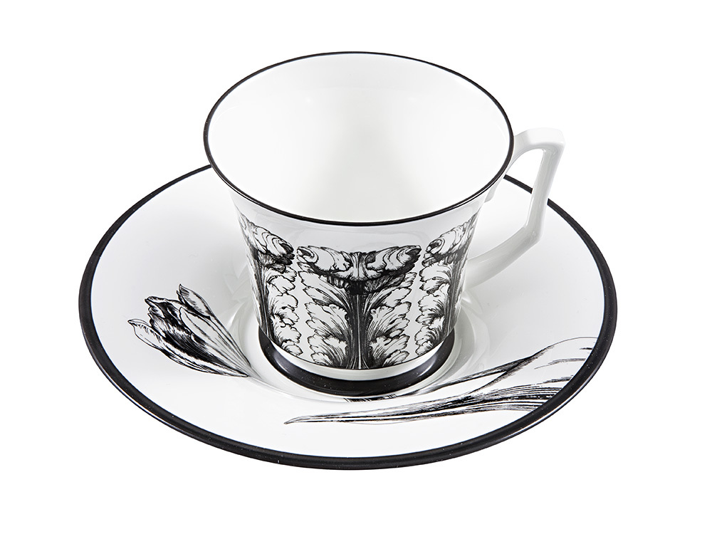 Светотень каждого изображения акцентирует рельефный декор деталей садового убранства. Гирлянды и розетки, листья тропического растения – аканта, декорирующие капители ордеров, выполнены в технике гравюры – они будто переместились с холодной архитектуры на тончайший костяной фарфор. Цветок тюльпана выражает целый мир чувств, наделяет моменты жизни обновлением и спокойной созерцательностью. Исторически украшающий не только сады, но и дорогой текстиль, тюльпан особо близок Сергею Сысоеву: автор неоднократно обращается к его изображению в своих коллекциях.